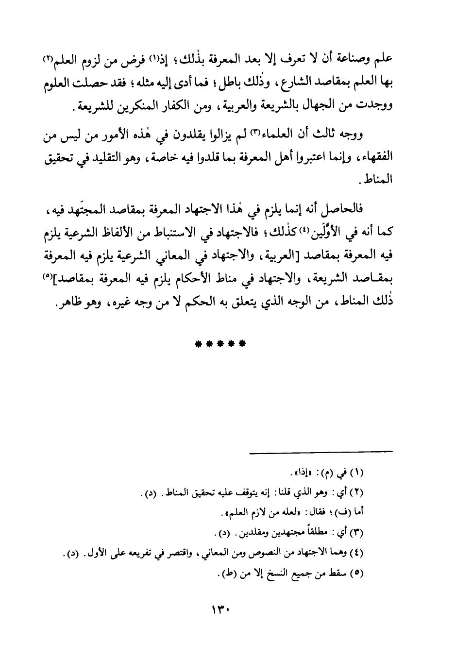 فَالْحَاصِلُ أَنَّهُ إِنَّمَا يَلْزَمُ فِي هَذَا الِاجْتِهَادِ الْمَعْرِفَةُ بِمَقَاصِدِ الْمُجْتَهِدِ فِيهِ، كَمَا أَنَّهُ فِي الْأَوَّلِينَ4 كَذَلِكَ، فَالِاجْتِهَادُ فِي الِاسْتِنْبَاطِ مِنَ الْأَلْفَاظِ الشَّرْعِيَّةِ يَلْزَمُ فِيهِ الْمَعْرِفَةُ بِمَقَاصِدِ [الْعَرَبِيَّةِ، وَالِاجْتِهَادُ فِي الْمَعَانِي الشَّرْعِيَّةِ يَلْزَمُ فِيهِ الْمَعْرِفَةُ بِمَقَاصِدِ الشَّرِيعَةِ، وَالِاجْتِهَادُ فِي مَنَاطِ الْأَحْكَامِ يَلْزَمُ فِيهِ الْمَعْرِفَةُ بِمَقَاصِدِ] 5 ذَلِكَ الْمَنَاطِ، مِنَ الْوَجْهِ الَّذِي يَتَعَلَّقُ بِهِ الْحُكْمُ لَا من وجه غيره، وهو ظاهر.