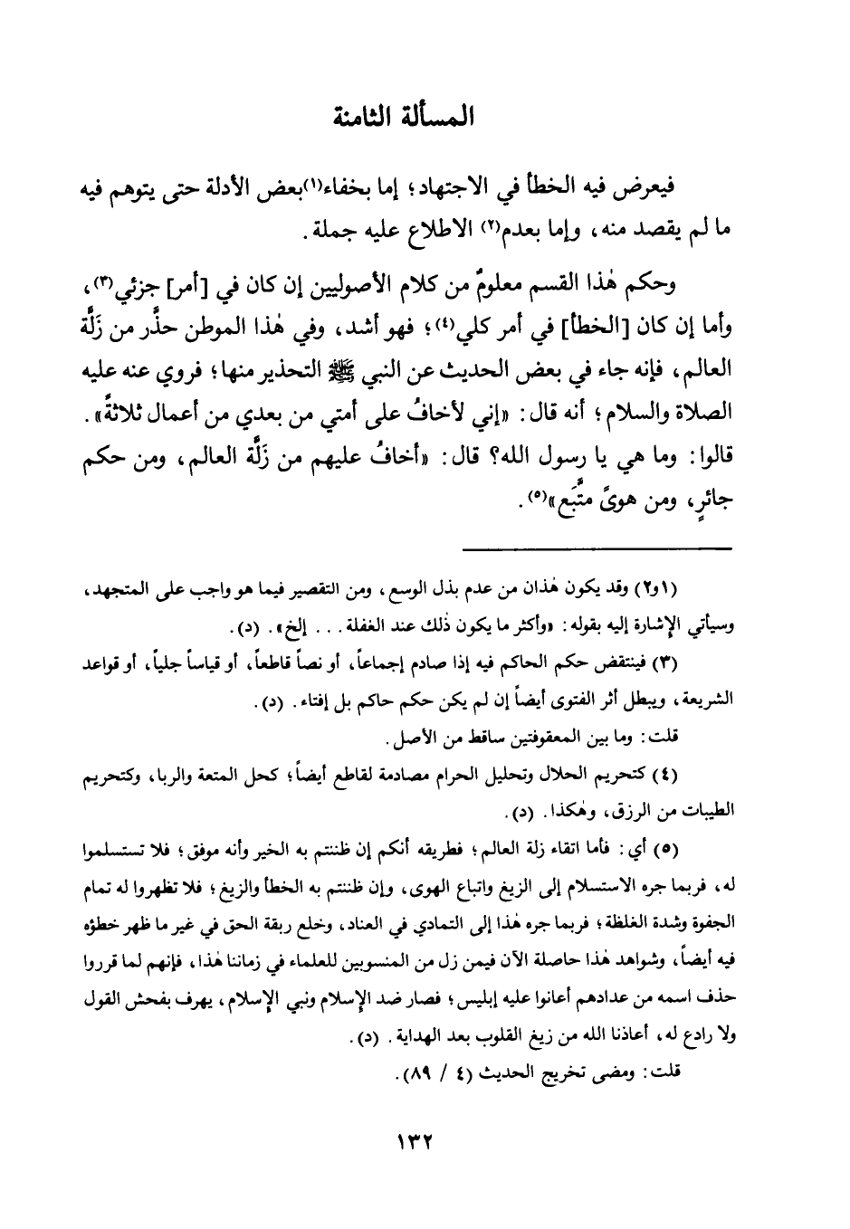 وَحُكْمُ هَذَا الْقِسْمِ مَعْلُومٌ مِنْ كَلَامِ الْأُصُولِيِّينَ إِنْ كَانَ فِي [أَمْرٍ] جُزْئِيٍّ3، وَأَمَّا إِنْ كَانَ [الْخَطَأُ] فِي أَمْرٍ كُلِّيٍّ4، فَهُوَ أَشَدُّ وَفِي هَذَا الْمَوْطِنِ حَذَرٌ مِنْ زَلَّةِ الْعَالِمِ، فَإِنَّهُ جَاءَ فِي بَعْضِ الْحَدِيثِ عَنِ النَّبِيِّ صَلَّى اللَّهُ عَلَيْهِ وَسَلَّمَ التَّحْذِيرُ مِنْهَا؛ فَرُوِيَ عَنْهُ عَلَيْهِ الصَّلَاةُ وَالسَّلَامُ، أَنَّهُ قَالَ: "إِنِّي لَأَخَافُ عَلَى أُمَّتِي مِنْ بَعْدِي مِنْ أَعْمَالٍ ثَلَاثَةٍ". قَالُوا: وَمَا هِيَ يَا رَسُولَ اللَّهِ؟ قَالَ: "أَخَافُ عَلَيْهِمْ مِنْ زَلَّةِ الْعَالِمِ، وَمِنْ حُكْمٍ جائرٍِ، وَمِنْ هَوًى متَّبع"5.