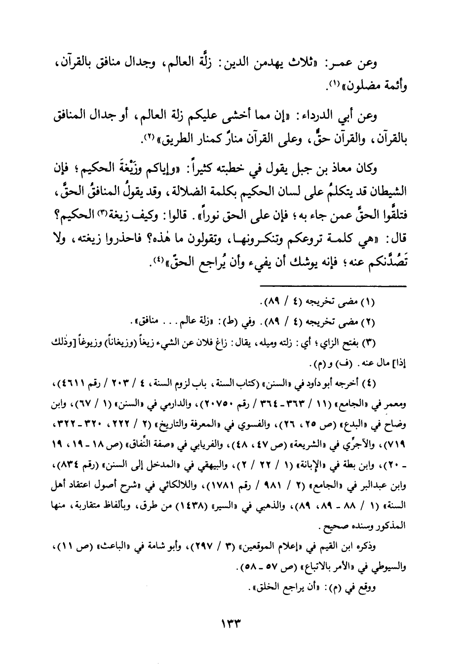 وَعَنْ أَبِي الدَّرْدَاءِ: "إِنَّ مِمَّا أَخْشَى عَلَيْكُمْ زَلَّةُ الْعَالِمِ، أَوْ جِدَالُ الْمُنَافِقِ بِالْقُرْآنِ، وَالْقُرْآنُ حقٌّ، وَعَلَى الْقُرْآنِ منارٌ كَمَنَارِ الطَّرِيقِ"2.