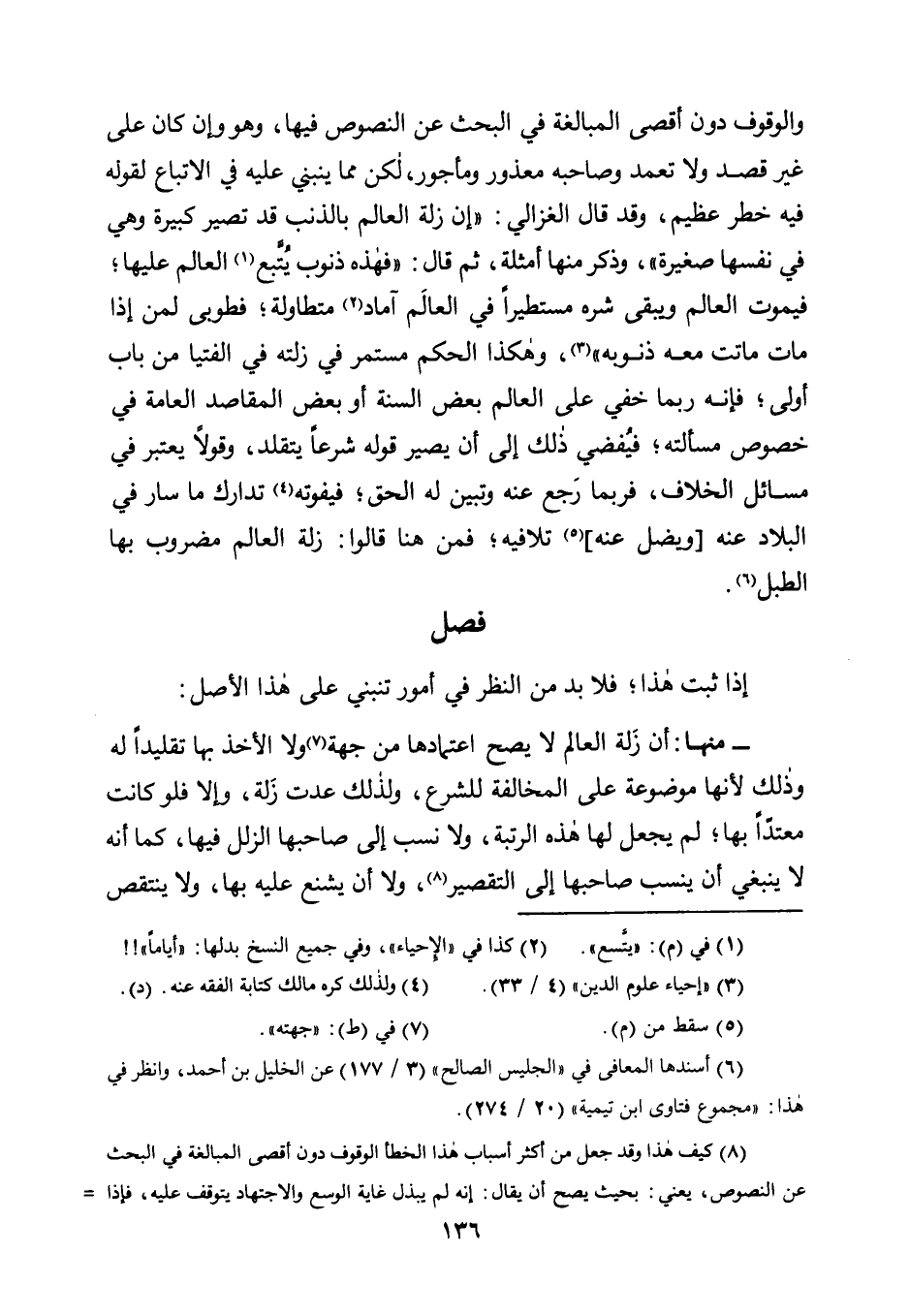 وَالْوُقُوفِ دُونَ أَقْصَى الْمُبَالَغَةِ فِي الْبَحْثِ عَنِ النُّصُوصِ فِيهَا، وَهُوَ وَإِنْ كَانَ عَلَى غَيْرِ قَصْدٍ وَلَا تَعَمُّدٍ وَصَاحِبُهُ مَعْذُورٌ وَمَأْجُورٌ، لَكِنْ مِمَّا يَنْبَنِي عَلَيْهِ فِي الِاتِّبَاعِ لِقَوْلِهِ فِيهِ خَطَرٌ عَظِيمٌ، وَقَدْ قَالَ الْغَزَالِيُّ: "إِنَّ زَلَّةَ الْعَالِمِ بِالذَّنْبِ قَدْ تَصِيرُ كَبِيرَةً وَهِيَ فِي نَفْسِهَا صَغِيرَةٌ"، وَذَكَرَ مِنْهَا أَمْثِلَةً، ثُمَّ قَالَ: "فَهَذِهِ ذُنُوبٌ يُتَّبَعُ1 الْعَالِمُ عَلَيْهَا، فَيَمُوتُ الْعَالِمُ ويبقى شره مستطيرًا في العالم آماد2 مُتَطَاوِلَةً، فَطُوبَى لِمَنْ إِذَا مَاتَ مَاتَتْ مَعَهُ ذُنُوبُهُ"3، وَهَكَذَا الْحُكْمُ مُسْتَمِرٌّ فِي زَلَّتِهِ فِي الْفُتْيَا مِنْ بَابٍ أَوْلَى، فَإِنَّهُ رُبَّمَا خَفِيَ عَلَى الْعَالِمِ بَعْضُ السُّنَّةِ أَوْ بَعْضُ الْمَقَاصِدِ الْعَامَّةِ فِي خُصُوصِ مَسْأَلَتِهِ، فَيُفْضِي ذَلِكَ إِلَى أَنْ يَصِيرَ قَوْلُهُ شَرْعًا يُتَقَلَّدُ، وَقَوْلًا يُعْتَبَرُ فِي مَسَائِلِ الْخِلَافِ، فَرُبَّمَا رَجَعَ عَنْهُ وَتَبَيَّنَ لَهُ الْحَقُّ فَيَفُوتُهُ4 تَدَارُكُ مَا سَارَ فِي الْبِلَادِ عَنْهُ [وَيَضِلُّ عَنْهُ] 5 تَلَافِيهِ، فَمِنْ هُنَا قَالُوا: زَلَّةُ الْعَالِمِ مَضْرُوبٌ بِهَا الطَّبْلُ6.