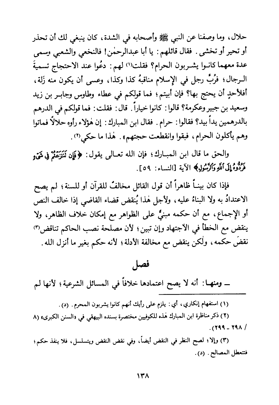 فَإِذَا كَانَ بَيِّنًا ظَاهِرًا أَنَّ قَوْلَ الْقَائِلِ مُخَالِفٌ لِلْقُرْآنِ أَوْ لِلسُّنَّةِ، لَمْ يَصِحَّ الاعتدادُ بِهِ وَلَا البناءُ عَلَيْهِ، وَلِأَجْلِ هَذَا يُنْقَضُ قَضَاءُ الْقَاضِي إِذَا خَالَفَ النَّصَّ أَوِ الْإِجْمَاعَ، مَعَ أَنَّ حُكْمَهُ مبنيٌّ عَلَى الظَّوَاهِرِ مَعَ إِمْكَانِ خِلَافِ الظَّاهِرِ، وَلَا يُنْقَضُ مَعَ الْخَطَأِ فِي الِاجْتِهَادِ وَإِنْ تَبَيَّنَ؛ لِأَنَّ مَصْلَحَةَ نَصْبِ الْحَاكِمِ تُنَاقِضُ3 نَقْضَ حُكْمِهِ، وَلَكِنْ يُنْقَضُ مَعَ مُخَالَفَةِ الْأَدِلَّةِ؛ لِأَنَّهُ حُكْمٌ بِغَيْرِ مَا أَنْزَلَ اللَّهُ.