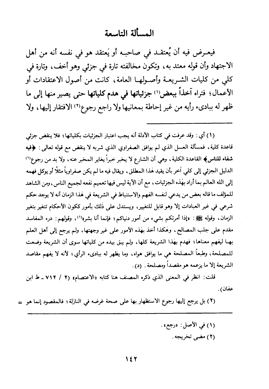 فَيَعْرِضُ فِيهِ أَنْ يُعْتَقَدَ فِي صَاحِبِهِ أَوْ يَعْتَقِدَ هُوَ فِي نَفْسِهِ أَنَّهُ مِنْ أَهْلِ الِاجْتِهَادِ وَأَنَّ قَوْلَهُ مُعْتَدٌّ بِهِ، وَتَكُونُ مُخَالَفَتُهُ تَارَةً فِي جُزْئِيٍّ وَهُوَ أَخَفُّ، وَتَارَةً فِي كُلِّيٍّ مِنْ كُلِّيَّاتِ الشَّرِيعَةِ وَأُصُولِهَا الْعَامَّةِ، كَانَتْ مِنْ أُصُولِ الِاعْتِقَادَاتِ أَوِ الْأَعْمَالِ؛ فَتَرَاهُ آخِذًا بِبَعْضِ1 جُزْئِيَّاتِهَا فِي هَدْمِ كُلِّيَّاتِهَا حَتَّى يَصِيرَ مِنْهَا إِلَى مَا ظَهَرَ لَهُ بِبَادِئِ رَأْيِهِ مِنْ غَيْرِ إِحَاطَةٍ بِمَعَانِيهَا وَلَا راجع رجوع2 الافتقار إليها، ولا