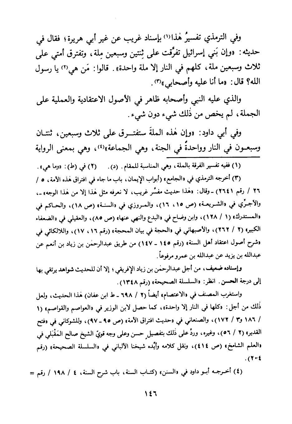 3 أخرجه الترمذي في "الجامع" "أبواب الإيمان، باب ما جاء في افترق هذه الأمة، 5/ 26/ رقم 2641" -وقال: "هذا حديث مفسر غريب، لا نعرفه مثل هذا إلا من هذا الوجه"-، والآجرِّي في "الشريعة" "ص15، 16"، والمروزي في "السنة" "ص18"، والحاكم في "المستدرك" "1/ 128"، وابن وضاح في "البدع والنهي عنها" "ص85"، والعقيلي في "الضعفاء الكبير" "2/ 262"، والأصبهاني في "الحجة في بيان المحجة" "رقم 16، 17"، واللالكائي في "شرح أصول اعتقاد أهل السنة" "رقم 145-147" من طريق عبد الرحمن بن زياد بن أنعم عن عبد الله بن يزيد عن عبد الله بن عمرو مرفوعًا.