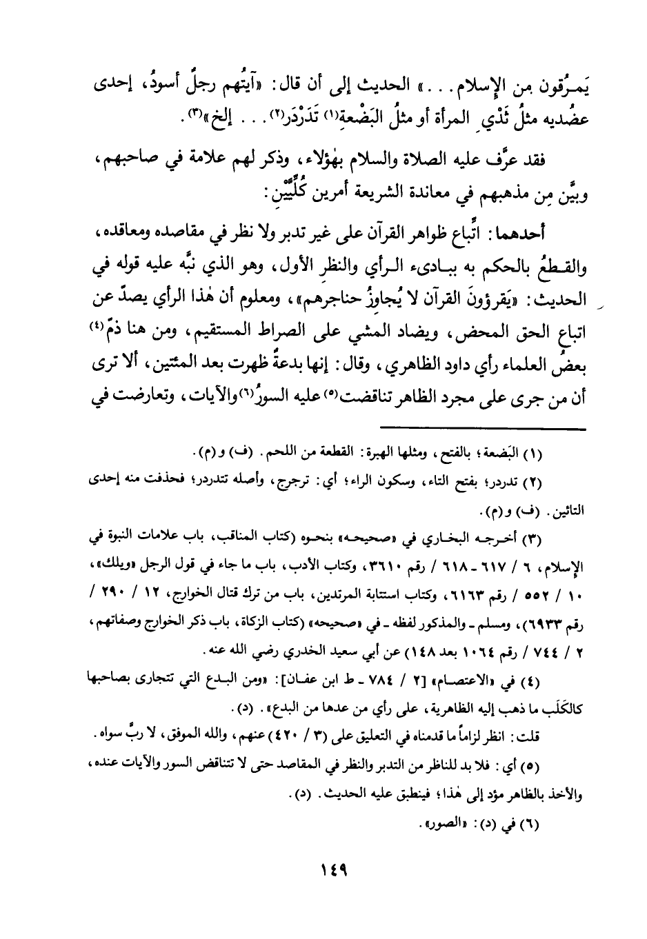 يمَرقوُن مِنَ الْإِسْلَامِ...." الْحَدِيثَ إِلَى أَنْ قَالَ: "آيتُهم رَجُلٌ أسودُ، إِحْدَى عضُديه مثلُ ثَدْيِ الْمَرْأَةِ أَوْ مِثْلُ البَضْعةِ 1 تَدَرْدَر 2 "..... إِلَخْ3.