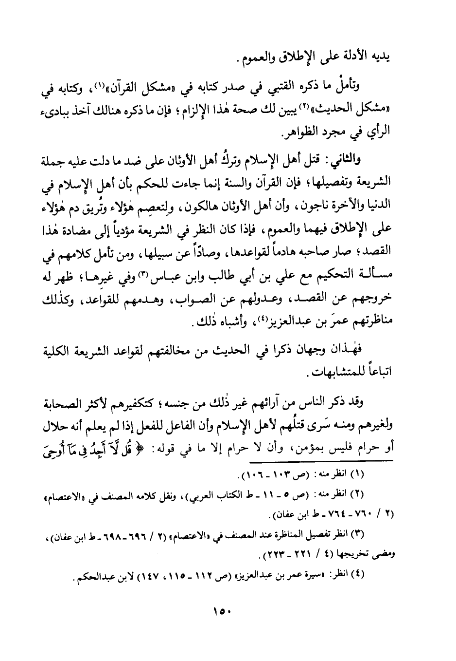 وَالثَّانِي قَتْلُ أَهْلِ الْإِسْلَامِ وَتَرْكُ أَهْلِ الْأَوْثَانِ عَلَى ضِدِّ مَا دَلَّتْ عَلَيْهِ جُمْلَةُ الشَّرِيعَةِ وَتَفْصِيلُهَا، فَإِنَّ الْقُرْآنَ وَالسُّنَّةَ إِنَّمَا جَاءَتْ لِلْحُكْمِ بِأَنَّ أَهْلَ الْإِسْلَامِ فِي الدُّنْيَا وَالْآخِرَةِ نَاجُونَ، وَأَنَّ أَهْلَ الْأَوْثَانِ هَالِكُونَ، وَلِتَعْصِمَ هَؤُلَاءِ وَتُرِيقَ دَمَ هَؤُلَاءِ عَلَى الْإِطْلَاقِ فِيهِمَا وَالْعُمُومِ، فَإِذَا كَانَ النَّظَرُ فِي الشَّرِيعَةِ مُؤَدِّيًا إِلَى مُضَادَّةِ هَذَا الْقَصْدِ، صَارَ صَاحِبُهُ هَادِمًا لِقَوَاعِدِهَا، وَصَادًّا عَنْ سَبِيلِهَا، وَمَنْ تَأَمَّلَ كَلَامَهُمْ فِي مَسْأَلَةِ التَّحْكِيمِ مَعَ عَلِيِّ بْنِ أَبِي طَالِبٍ وَابْنِ عَبَّاسٍ3 وَفِي غَيْرِهَا، ظَهَرَ لَهُ خُرُوجُهُمْ عَنِ الْقَصْدِ، وَعُدُولُهُمْ عَنِ الصَّوَابِ، وَهَدْمُهُمْ لِلْقَوَاعِدِ، وَكَذَلِكَ مُنَاظَرَتُهُمْ عُمَرَ بْنَ عَبْدِ الْعَزِيزِ4، وَأَشْبَاهُ ذَلِكَ.