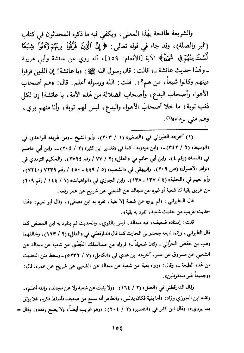وَالشَّرِيعَةُ طَافِحَةٌ بِهَذَا الْمَعْنَى، وَيَكْفِي فِيهِ مَا ذَكَرَهُ الْمُحَدِّثُونَ فِي كِتَابِ "الْبِرِّ وَالصِّلَةِ"، وَقَدْ جَاءَ فِي قَوْلِهِ تَعَالَى: {إِنَّ الَّذِينَ فَرَّقُوا دِينَهُمْ وَكَانُوا شِيَعًا لَسْتَ مِنْهُمْ فِي شَيْء} الْآيَةَ [الْأَنْعَامِ: 159] ، أَنَّهُ رُوِيَ عَنْ عَائِشَةَ وَأَبِي هُرَيْرَةَ -وَهَذَا حَدِيثُ عَائِشَةَ-، قَالَتْ: قَالَ رَسُولُ اللَّهِ صَلَّى اللَّهُ عَلَيْهِ وَسَلَّمَ: "يَا عَائِشَةُ! إِنَّ الَّذِينَ فَرَّقُوا دَيْنَهُمْ وَكَانُوا شِيَعًا، مَنْ هُمْ؟ ". قُلْتُ: اللَّهُ وَرَسُولُهُ أَعْلَمُ. قَالَ: "هُمْ أَصْحَابُ الْأَهْوَاءِ وَأَصْحَابُ الْبِدَعِ، وَأَصْحَابُ الضَّلَالَةِ مِنْ هَذِهِ الْأُمَّةِ، يَا عَائِشَةُ! إِنَّ لِكُلِّ ذَنْبٍ تَوْبَةً؛ مَا خَلَا أَصْحَابَ الْأَهْوَاءِ وَالْبِدَعِ، لَيْسَ لَهُمْ تَوْبَةٌ، وَأَنَا مِنْهُمْ بَرِيءٌ، وَهُمْ مِنِّيَ برءاء"1.