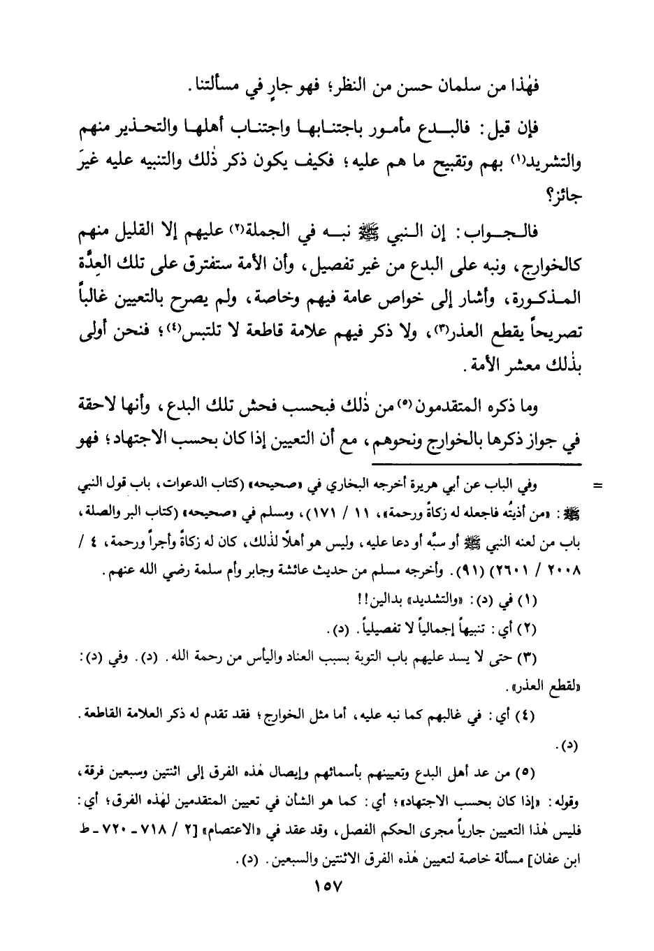 5 من عد أهل البدع وتعيينهم بأسمائهم وإيصال هذه الفرق إلى اثنتين وسبعين فرقة، وقوله: "إذا كان بحسب الاجتهاد"، أي: كما هو الشأن في تعيين المتقدمين لهذه الفرق، أي فليس هذا التعيين جاريًا مجرى الحكم الفصل، وقد عقد في "الاعتصام" "2/ 718-720 - ط ابن عفان" مسألة خاصة لتعيين هذه الفرق الاثنتين والسبعين. "د".