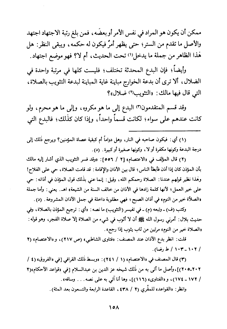 وَأَيْضًا، فَإِنَّ الْبِدَعَ الْمُحْدَثَةَ تَخْتَلِفُ، فَلَيْسَتْ كُلُّهَا فِي مَرْتَبَةٍ وَاحِدَةٍ فِي الضَّلَالِ، أَلَا تَرَى أَنَّ بِدْعَةَ الْخَوَارِجِ مُبَايِنَةً غَايَةَ الْمُبَايَنَةِ لِبِدْعَةِ التَّثْوِيبِ بِالصَّلَاةِ الَّتِي قَالَ فِيهَا مَالِكٌ: "التَّثْوِيبُ2 ضَلَالٌ"؟