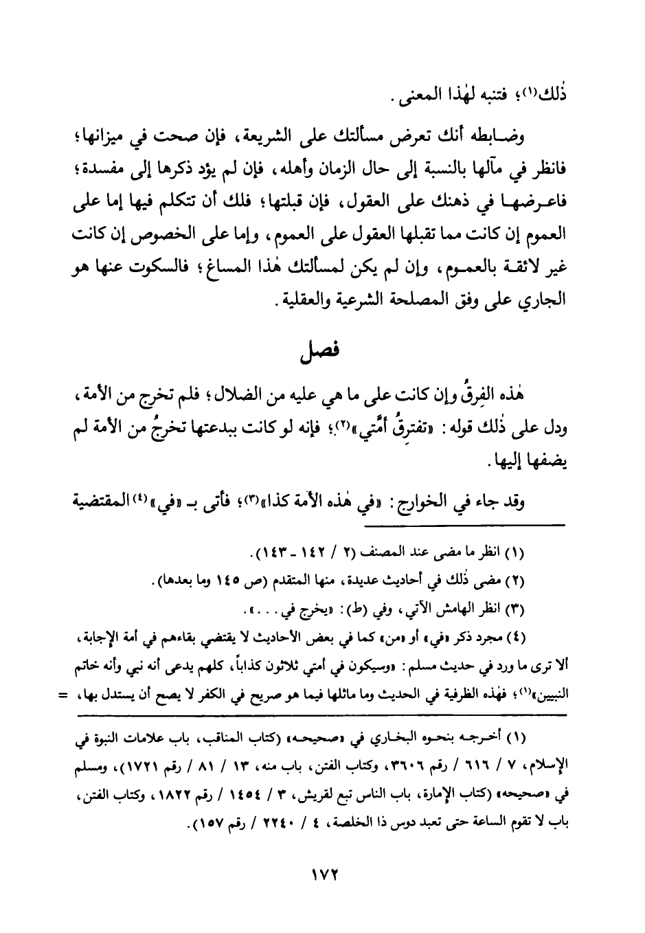 4 مجرد ذكر "في" أو "من" كما في بعض الأحاديث لا يقتضي بقاءهم في أمة الإجابة، ألا ترى ما ورد في حديث مسلم: "سيكون في أمتي ثلاثون كذابًا، كلهم يدعى أنه نبي وأنه خاتم النبيين" *، فهذه الظرفية في الحديث وما ماثلها فيما هو صريح في الكفر لا يصح أن يستدل بها. =