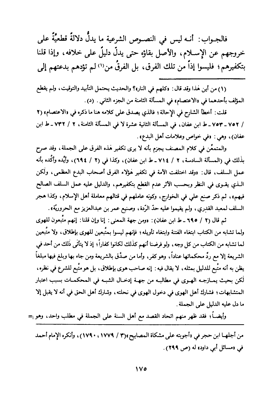والمتمعن في كلام المصنف يجزم بأنه لا يرى تكفير هذه الفرق على الجملة، وقد صرح بذلك في "المسألة السادسة، 2/ 714 - ط ابن عفان"، وكذا في "2/ 694"، وأيده وأكده بأنه عمل السلف قال: "وقد اختلفت الأمة في تكفير هؤلاء الفرق أصحاب البدع العظمى، ولكن الذي يقوى في النظر وبحسب الأثر عدم القطع بتكفيرهم، والدليل عليه علم السلف الصالح فيهم"، ثم ذكر صنع علي في الخوارج، وكونه عاملهم في قتالهم معاملة أهل الإسلام، وكذا هجر السلف لمعبد القدري، ولم يقيموا عليه حد الردة، وصنيع عمر بن عبد العزيز مع الحرورية".