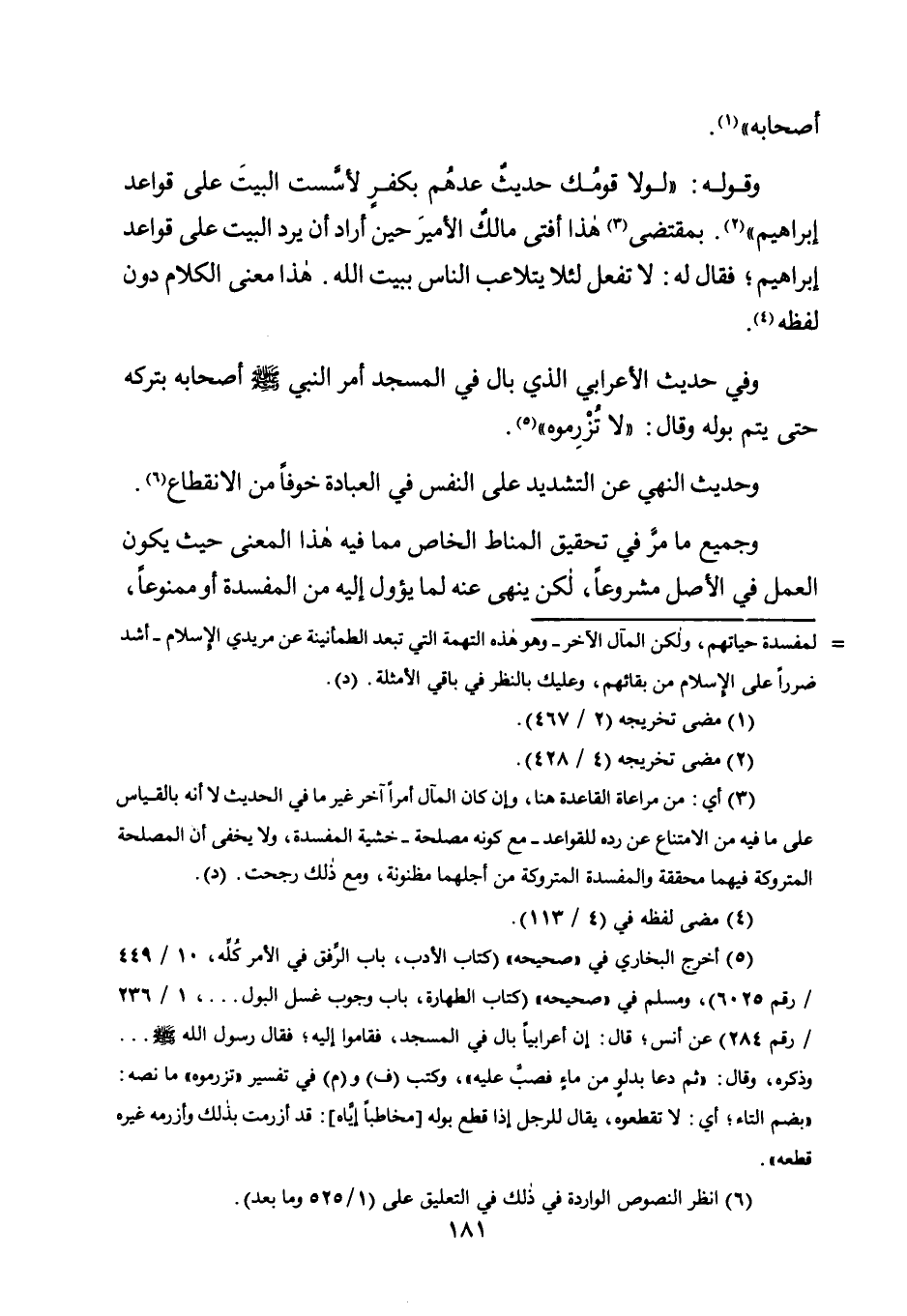 وقوله: "لولا قومك حديث عدهم بِكُفْرٍ لَأَسَّسْتُ الْبَيْتَ عَلَى قَوَاعِدِ إِبْرَاهِيمَ" 2. بِمُقْتَضَى3 هَذَا أَفْتَى مَالِكٌ الْأَمِيرَ حِينَ أَرَادَ أَنْ يَرُدَّ الْبَيْتَ عَلَى قَوَاعِدِ إِبْرَاهِيمَ، فَقَالَ لَهُ: لَا تَفْعَلْ لِئَلَّا يَتَلَاعَبَ النَّاسُ بِبَيْتِ اللَّهِ. هَذَا مَعْنَى الْكَلَامِ دُونَ لَفْظِهِ4.