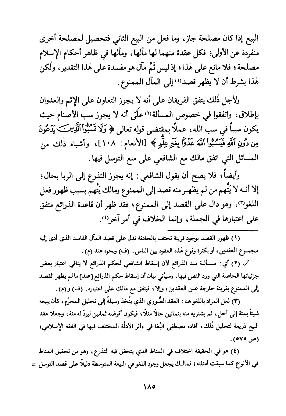 وَلِأَجْلِ ذَلِكَ يَتَّفِقُ الْفَرِيقَانِ عَلَى أَنَّهُ لَا يَجُوزُ التَّعَاوُنُ عَلَى الْإِثْمِ وَالْعُدْوَانِ بِإِطْلَاقٍ، وَاتَّفَقُوا فِي خُصُوصِ الْمَسْأَلَةِ2 عَلَى أَنَّهُ لَا يَجُوزُ سَبُّ الْأَصْنَامِ حَيْثُ يَكُونُ سَبَبًا فِي سَبِّ اللَّهِ، عَمَلًا بِمُقْتَضَى قَوْلِهِ تَعَالَى: {وَلا تَسُبُّوا الَّذِينَ يَدْعُونَ مِنْ دُونِ اللَّهِ فَيَسُبُّوا اللَّهَ عَدْوًا بِغَيْرِ عِلْمٍ} [الْأَنْعَامِ: 108] ، وَأَشْبَاهُ ذَلِكَ مِنَ الْمَسَائِلِ الَّتِي اتَّفَقَ مَالِكٌ مَعَ الشَّافِعِيِّ عَلَى مَنْعِ التَّوَسُّلِ فِيهَا.