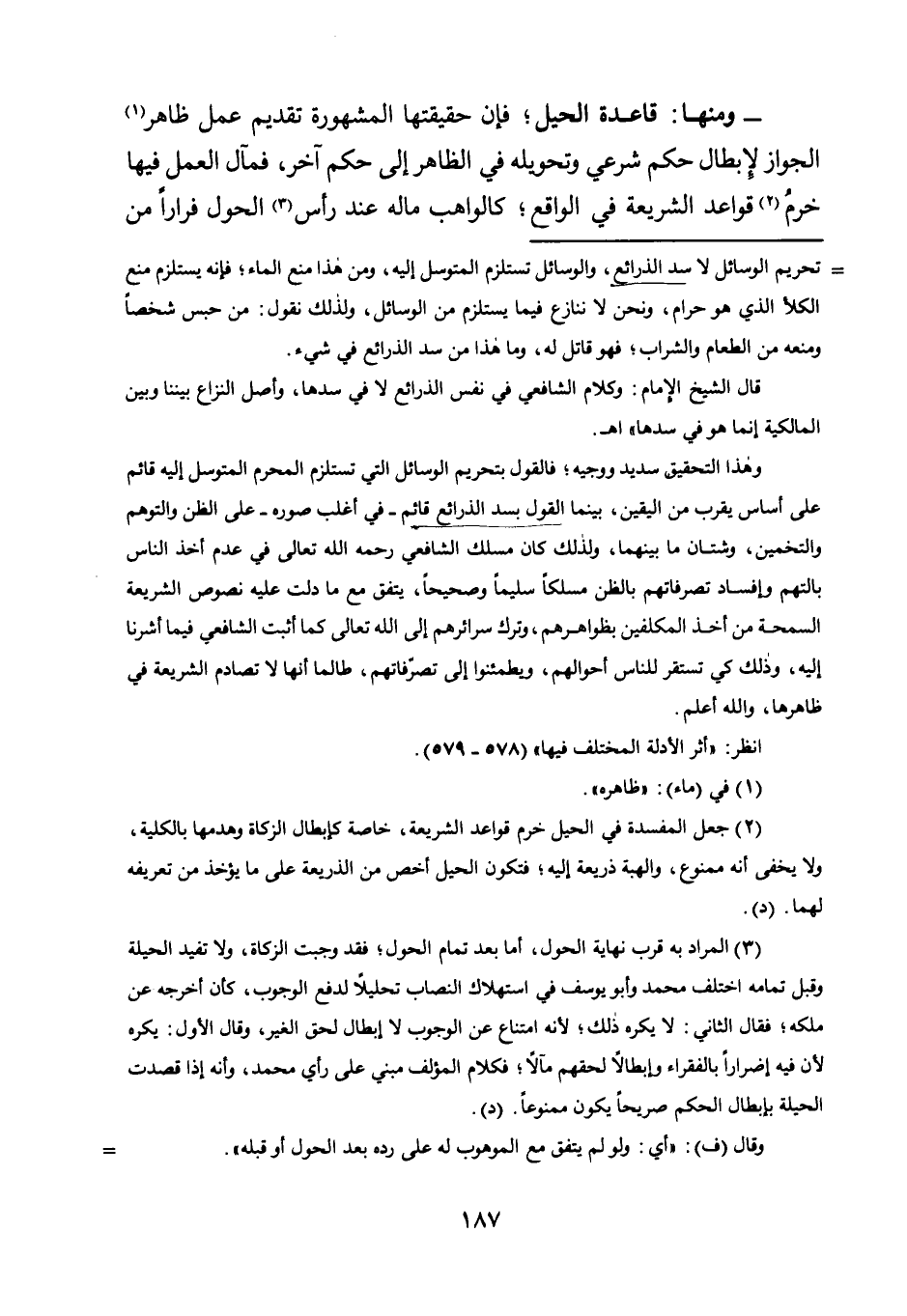 - وَمِنْهَا: قَاعِدَةُ الْحِيَلِ، فَإِنَّ حَقِيقَتَهَا الْمَشْهُورَةَ تَقْدِيمُ عَمَلٍ ظَاهِرِ1 الْجَوَازِ لِإِبْطَالِ حُكْمٍ شَرْعِيٍّ وَتَحْوِيلِهِ فِي الظَّاهِرِ إِلَى حُكْمٍ آخَرَ، فَمَآلُ الْعَمَلِ فِيهَا خَرْمُ2 قَوَاعِدِ الشَّرِيعَةِ فِي الْوَاقِعِ، كَالْوَاهِبِ ماله عند رأس3 الحول فرارًا من
