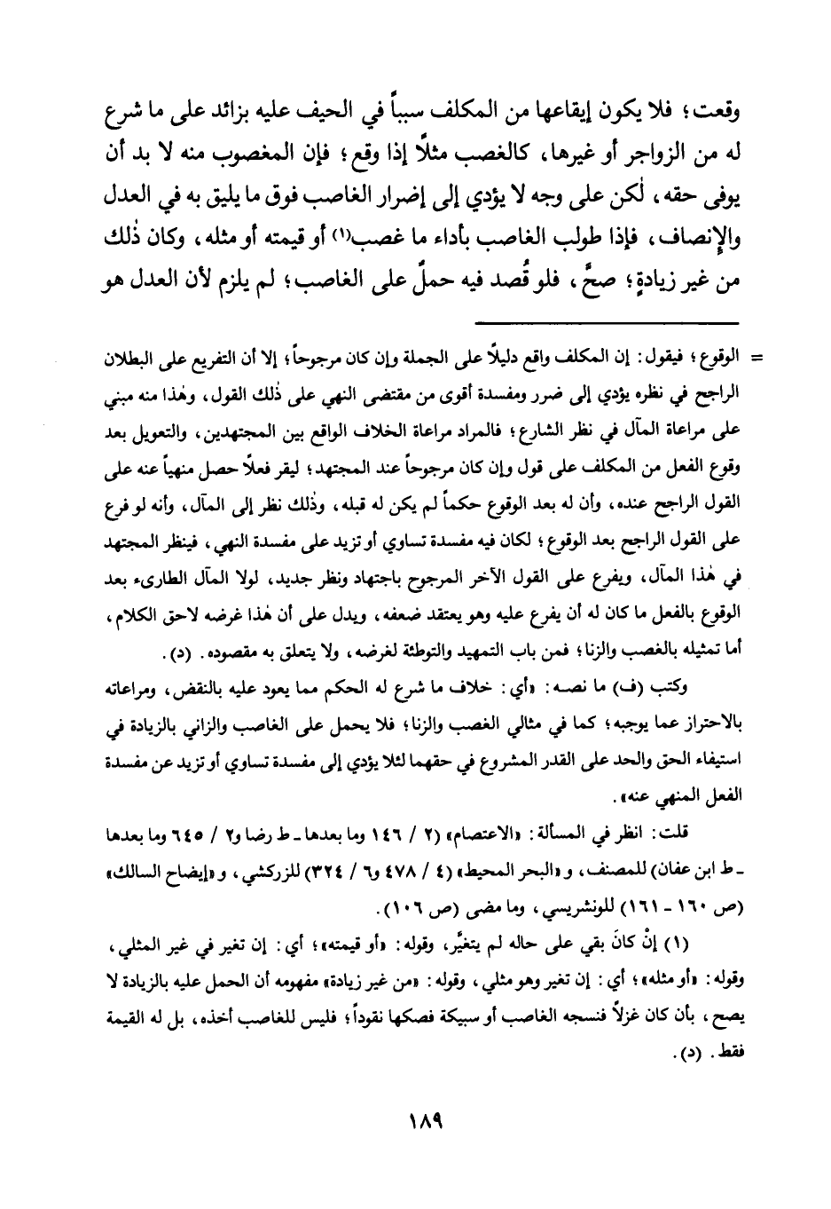 وكتب "ف" ما نصه: "أي: خلاف ما شرع له الحكم مما يعود عليه بالنقض، ومراعاته بالاحتراز عما يوجبه، كما في مثالي الغصب والزنا، فلا يحمل على الغاصب والزاني بالزيادة في استيفاء الحق والحد على القدر المشروع في حقهما لئلا يؤدي إلى مفسدة تساوي أو تزيد عن مفسدة الفعل المنهي عنه".