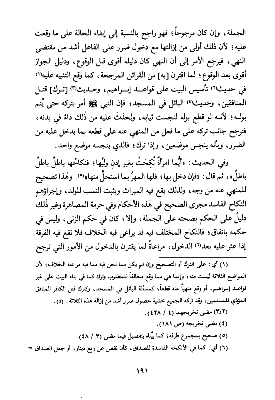 الْجُمْلَةِ، وَإِنْ كَانَ مَرْجُوحًا، فَهُوَ رَاجِحٌ بِالنِّسْبَةِ إِلَى إِبْقَاءِ الْحَالَةِ عَلَى مَا وَقَعَتْ عَلَيْهِ؛ لِأَنَّ ذَلِكَ أَوْلَى مِنْ إِزَالَتِهَا مَعَ دُخُولِ ضَرَرٍ عَلَى الْفَاعِلِ أَشَدِّ مِنْ مُقْتَضَى النَّهْيِ، فَيَرْجِعُ الْأَمْرُ إِلَى أَنَّ النَّهْيَ كَانَ دَلِيلُهُ أَقْوَى قَبْلَ الْوُقُوعِ، وَدَلِيلُ الْجَوَازِ أَقْوَى بَعْدَ الْوُقُوعِ، لِمَا اقْتَرَنَ [بِهِ] مِنَ الْقَرَائِنِ الْمُرَجِّحَةِ، كَمَا وَقَعَ التَّنْبِيهُ عَلَيْهِ1 فِي حَدِيثِ2 تَأْسِيسِ الْبَيْتِ عَلَى قَوَاعِدِ إِبْرَاهِيمَ، وَحَدِيثِ3 [تَرْكِ] قَتْلِ الْمُنَافِقِينَ، وَحَدِيثِ4 الْبَائِلِ فِي الْمَسْجِدِ، فَإِنَّ النَّبِيَّ صَلَّى اللَّهُ عَلَيْهِ وَسَلَّمَ أَمَرَ بِتَرْكِهِ حَتَّى يُتِمَّ بَوْلَهُ؛ لِأَنَّهُ لَوْ قُطِعَ بَوْلُهُ لَنَجِسَتْ ثِيَابُهُ، وَلَحَدَثَ عَلَيْهِ مِنْ ذَلِكَ دَاءٌ فِي بَدَنِهِ، فَتَرَجَّحَ جَانِبُ تَرْكِهِ عَلَى مَا فَعَلَ مِنَ الْمَنْهِيِّ عَنْهُ عَلَى قَطْعِهِ بِمَا يَدْخُلُ عَلَيْهِ مِنَ الضَّرَرِ، وَبِأَنَّهُ يُنَجِّسُ مَوْضِعَيْنِ وَإِذَا تُرِكَ، فَالَّذِي يُنَجِّسُهُ مَوْضِعٌ وَاحِدٌ.