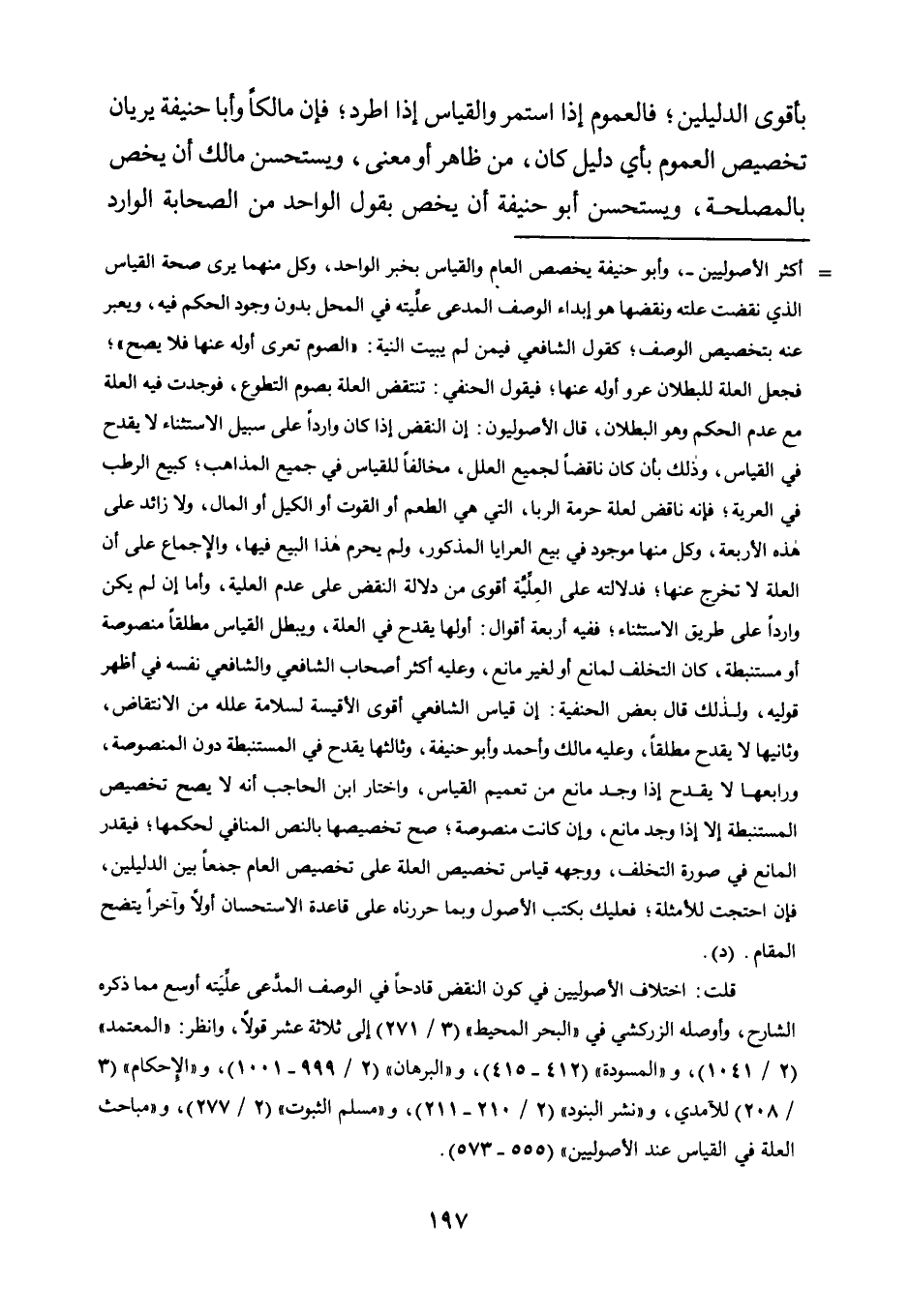 = أكثر الأصوليين-، وأبو حنيفة يخصص العام والقياس بخبر الواحد، وكل منهما يرى صحة القياس الذي نقضت علته ونقضها هو إبداء الوصف المدعى عليته في المحل بدون وجود الحكم فيه، ويعبر عنه بتخصيص الوصف، كقول الشافعي فيمن لم يبيت النية: "الصوم تعرى أوله عنها فلا يصح"، فجعل العلة للبطلان عرو أوله عنها، فيقول الحنفي: تنتقض العلة بصوم التطوع، فوجدت فيه العلة مع عدم الحكم وهو البطلان، قال الأصوليون: إن النقض إذا كان ورادًا على سبيل الاستثناء لا يقدح في القياس، وذلك بأن كان ناقضًا لجميع العلل، مخالفًا للقياس في جميع المذاهب، كبيع الرطب في العرية، فإنه ناقض لعلة حرمة الربا، التي هي الطعم أو القوت أو الكيل أو المال، ولا زائد على هذه الأربعة، وكل منها