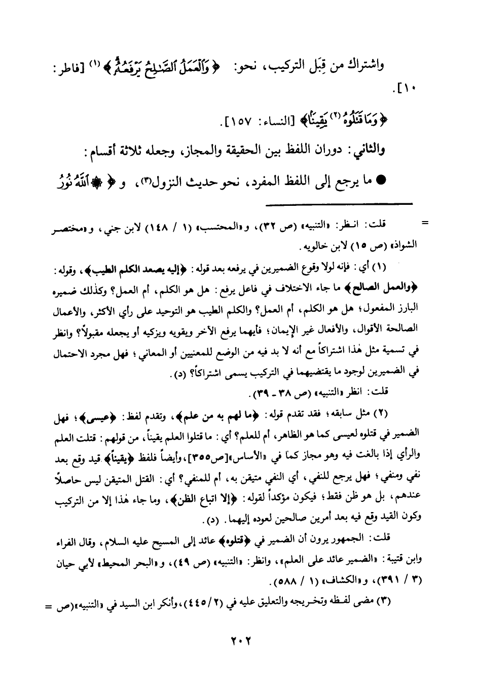2 مثل سابقه، فقد تقدم قوله: {مَا لَهُمْ بِهِ مِنْ عِلْمٍ} ، وتقدم لفظ: "عِيْسَىْ"، فهل الضمير في قتلوه لعيسى كما هو الظاهر، أم للعلم؟ أي: ما قتلوا العلم يقينًا، من قولهم: قتلت العلم والرأي إذا بالغت فيه وهو مجاز كما في "الأساس" "ص355"، وأيضًا فلفظ "يقِينًا" قيد وقع بعد نفي ومنفي، فهل يرجع للنفي، أي النفي متيقن به، أم للمنفي؟ أي: القتل المتيقن ليس حاصلًا عندهم، بل هو ظن فقط، فيكون مؤكدًا لقوله: {إِلَّا اتِّبَاعَ الظَّنّ} ، وما جاء هذا إلا من التركيب وكون القيد وقع فيه بعد أمرين صالحين لعوده إليهما. "د".