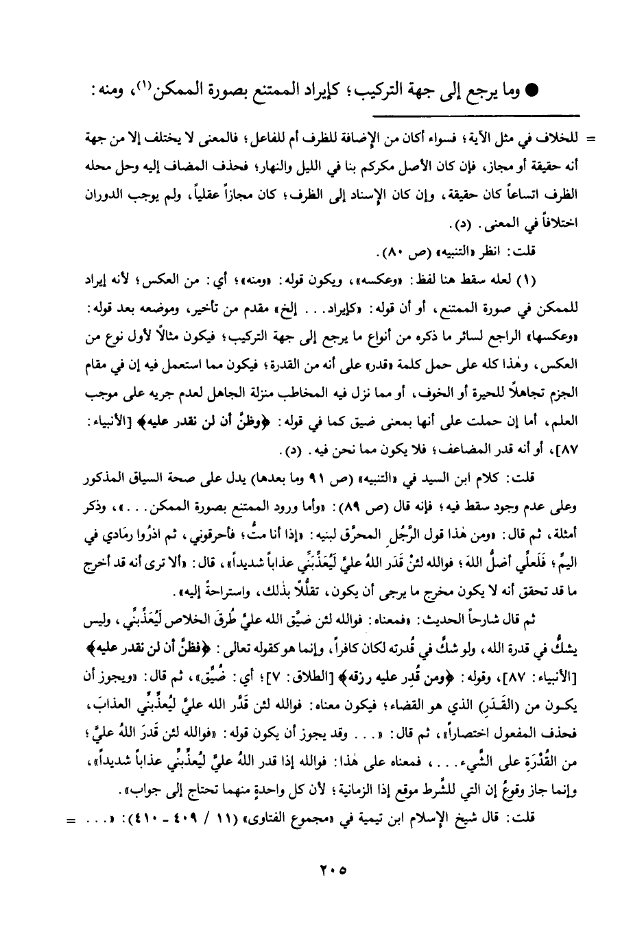 قلت: كلام ابن السيد في "التنبيه" "ص91 وما بعدها"، يدل على صحة السياق المذكور وعلى عدم وجود سقط فيه، فإنه قال "ص89": "وأما ورود الممتنع بصورة الممكن ... ". وذكر أمثلة، ثم قال: "ومن هذا قول الرجل المحرق لبنيه: "إذا أنا مت، فأحرقوني، ثم اذروا رمادي في اليم، فلعلي أضل الله، فوالله لئن قدر الله علي ليعذبني عذاباً شديداً"، قال: "ألا ترى أنه قد أخرج ما قد تحقق أنه لا يكون مجرج ما يرجي أن يكون، تقللاً بذلك، واستراحة إليه".