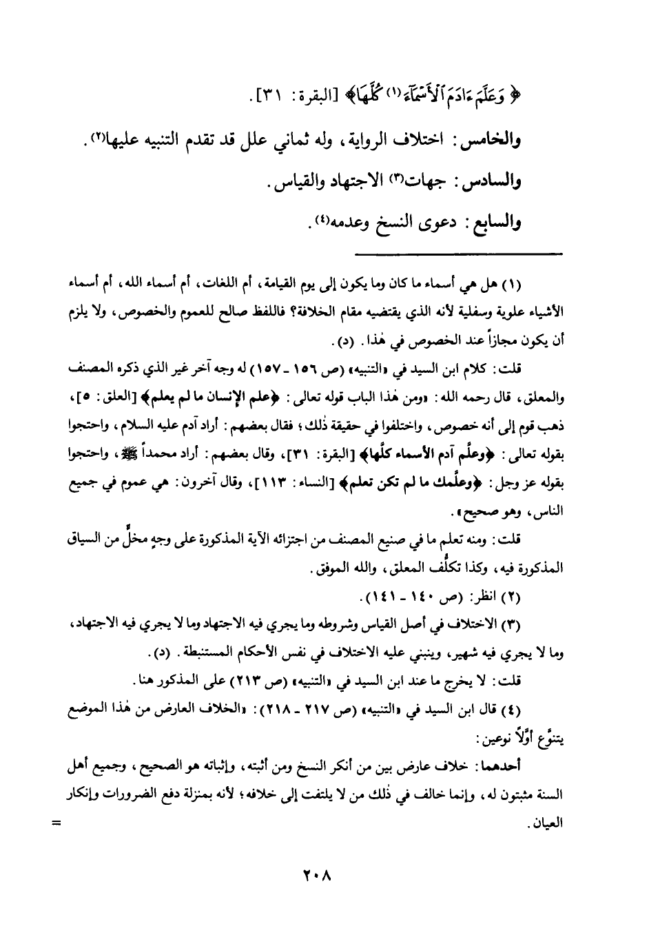 4 قال ابن السيد في "التنبيه" "ص217-218": "الخلاف العارض من هذا الموضع يتنوع أولًا نوعين: