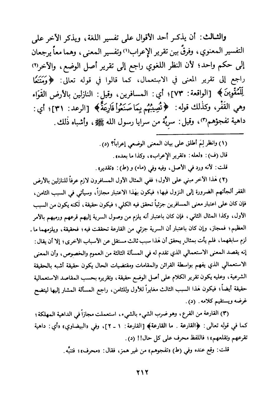 وَالثَّالِثُ: أَنْ يُذْكَرَ أَحَدُ الْأَقْوَالِ عَلَى تَفْسِيرِ اللُّغَةِ، وَيُذْكَرَ الْآخَرُ عَلَى التَّفْسِيرِ الْمَعْنَوِيِّ، وَفَرْقٌ بَيْنَ تَقْرِيرِ الْإِعْرَابِ1 وَتَفْسِيرِ الْمَعْنَى، وَهُمَا مَعًا يَرْجِعَانِ إِلَى حُكْمٍ وَاحِدٍ؛ لِأَنَّ النَّظَرَ اللُّغَوِيَّ رَاجِعٌ إِلَى تَقْرِيرِ أَصْلِ الْوَضْعِ، وَالْآخَرَ2 رَاجِعٌ إِلَى تَقْرِيرِ الْمَعْنَى فِي الِاسْتِعْمَالِ، كَمَا قَالُوا فِي قَوْلِهِ تَعَالَى: {وَمَتَاعًا لِلْمُقْوِين} [الْوَاقِعَةِ: 73] ، أَيِ: الْمُسَافِرِينَ، وَقِيلَ: النَّازِلِينَ بِالْأَرْضِ الْقِوَاءِ وَهِيَ الْقَفْرُ، وَكَذَلِكَ قَوْلُهُ: {تُصِيبُهُمْ بِمَا صَنَعُوا قَارِعَة} [الرَّعْدِ: 31] ، أَيْ: دَاهِيَةٌ تَفْجَؤُهُمْ3، وَقِيلَ: سَرِيَّةٌ مِنْ سَرَايَا رَسُولِ اللَّهِ صَلَّى اللَّهُ عَلَيْهِ وَسَلَّمَ، وَأَشْبَاهُ ذلك.