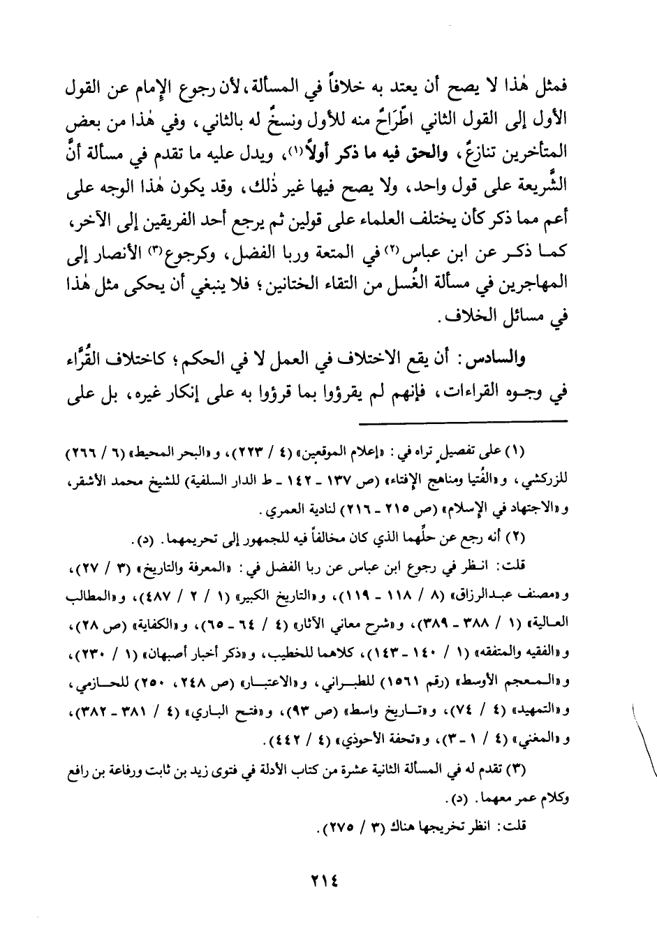 فَمِثْلُ هَذَا لَا يَصِحُّ أَنْ يُعْتَدَّ بِهِ خِلَافًا فِي الْمَسْأَلَةِ؛ لِأَنَّ رُجُوعَ الْإِمَامِ عَنِ الْقَوْلِ الْأَوَّلِ إِلَى الْقَوْلِ الثَّانِي اطِّرَاحٌ مِنْهُ لِلْأَوَّلِ وَنَسْخٌ لَهُ بِالثَّانِي، وَفِي هَذَا مِنْ بَعْضِ الْمُتَأَخِّرِينَ تَنَازُعٌ، وَالْحَقُّ فِيهِ مَا ذُكِرَ أَوَّلًا1، وَيَدُلُّ عَلَيْهِ مَا تَقَدَّمَ فِي مَسْأَلَةِ أَنَّ الشَّرِيعَةَ عَلَى قَوْلٍ وَاحِدٍ، وَلَا يَصِحُّ فِيهَا غَيْرُ ذَلِكَ، وَقَدْ يَكُونُ هَذَا الْوَجْهُ عَلَى أَعَمِّ مِمَّا ذُكِرَ كَأَنْ يَخْتِلَفَ الْعُلَمَاءُ عَلَى قَوْلَيْنِ ثُمَّ يَرْجِعُ أَحَدُ الْفَرِيقَيْنِ إِلَى الْآخَرِ، كَمَا ذُكِرَ عَنِ ابْنِ عَبَّاسٍ2 فِي الْمُتْعَةِ وَرِبَا الْفَضْلِ، وَكَرُجُوعِ3 الْأَنْصَارِ إِلَى الْمُهَاجِرِينَ فِي مَسْأَلَةِ الْغُسْلِ مِنَ الْتِقَاءِ الْخِتَانَيْنِ، فَلَا يَنْبَغِي أَنْ يُحْكَى مِثْلُ هَذَا فِي مَسَائِلِ الْخِلَافِ.