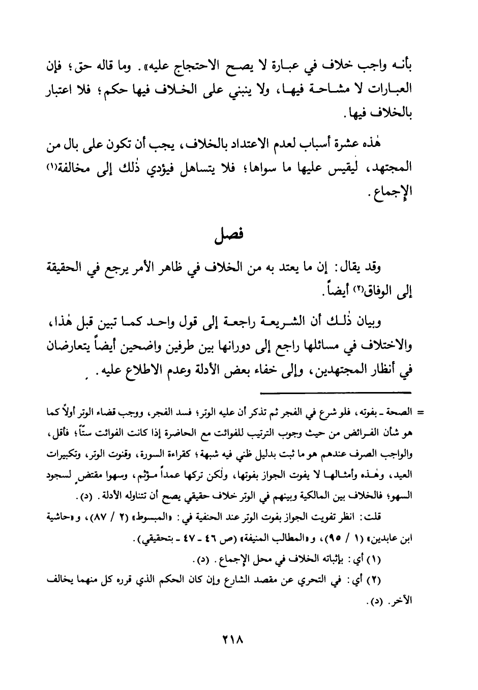 = الصحة- بفوته، فلو شرع في الفجر ثم تذكر أن عليه الوتر، فسد الفجر، ووجب قضاء الوتر أولًا كما هو شأن الفرائض من حيث وجوب الترتيب للفوائت مع الحاضرة إذا كانت الفوائت ستًّا فأقل، والواجب الصرف عندهم هو ما ثبت بدليل ظني فيه شبهة، كقراءة السورة، وقنوت الوتر، وتكبيرات العيد، وهذه وأمثالها لا يفوت الجواز بفوتها، ولكن تركها عمدًا مؤثم، وسهوا مقتض لسجود السهو، فالخلاف بين المالكية وبينهم في الوتر خلاف حقيقي يصح أن تتناوله الأدلة. "د".