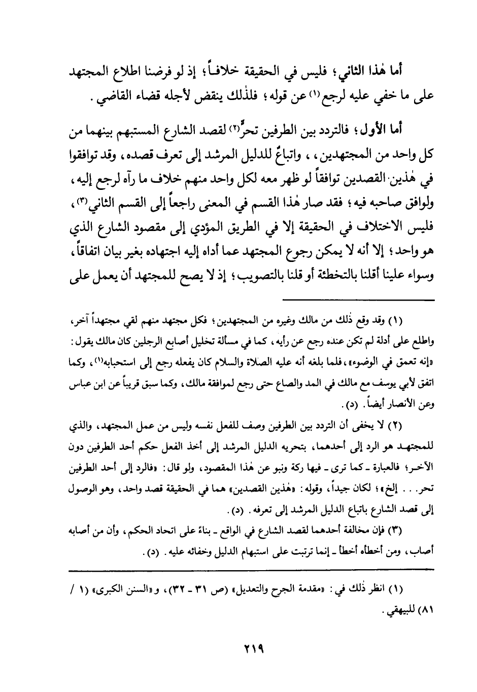 أَمَّا الْأَوَّلُ، فَالتَّرَدُّدُ بَيْنَ الطَّرَفَيْنِ تَحَرٍّ2 لِقَصْدِ الشَّارِعِ الْمُسْتَبْهَمِ بَيْنَهُمَا مِنْ كُلِّ وَاحِدٍ مِنَ الْمُجْتَهِدِينَ، وَاتِّبَاعٌ لِلدَّلِيلِ الْمُرْشِدِ إِلَى تَعَرُّفِ قَصْدِهِ، وَقَدْ تَوَافَقُوا فِي هَذَيْنِ الْقَصْدَيْنِ تَوَافُقًا لَوْ ظَهَرَ مَعَهُ لِكُلِّ وَاحِدٍ مِنْهُمْ خِلَافُ مَا رَآهُ لَرَجَعَ إِلَيْهِ، وَلَوَافَقَ صَاحِبَهُ فِيهِ، فَقَدْ صَارَ هَذَا الْقِسْمُ فِي الْمَعْنَى رَاجِعًا إِلَى الْقِسْمِ الثَّانِي3، فَلَيْسَ الِاخْتِلَافُ فِي الْحَقِيقَةِ إِلَّا فِي الطَّرِيقِ الْمُؤَدِّي إِلَى مَقْصُودِ الشَّارِعِ الَّذِي هُوَ وَاحِدٌ، إِلَّا أَنَّهُ لَا يُمْكِنُ رُجُوعُ الْمُجْتَهِدِ عَمَّا أَدَّاهُ إِلَيْهِ اجْتِهَادُهُ بِغَيْرِ بَيَانٍ اتِّفَاقًا، وَسَوَاءٌ عَلَيْنَا أَقُلْنَا بالتخطئة أم قلنا بالتصويب، إذا لا يصح للمجتهد أن يعمل على