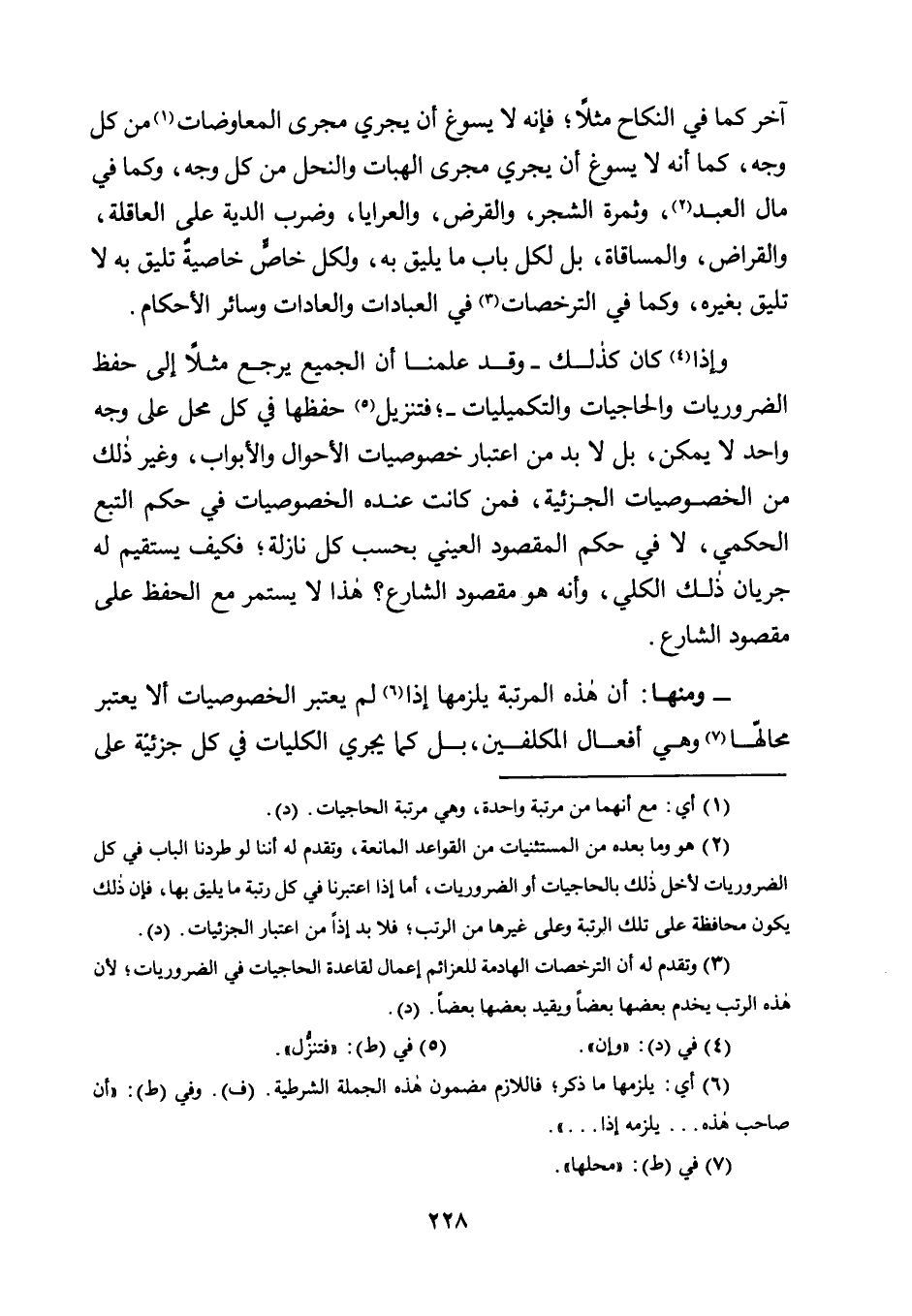 2 هو وما بعده من المستثنيات من القواعد المانعة، وتقدو له أننا لو طردنا الباب في كل الضروريات لأجل ذلك بالحاجيات أو الضروريات، أما إذا اعتبرنا في كل رتبة ما يليق بها، فإن ذلك يكون محافظة على تلك الرتبة وعلى غيرها من الرتب، فلا بد إذن من اعتبار الجزئيات. "د".