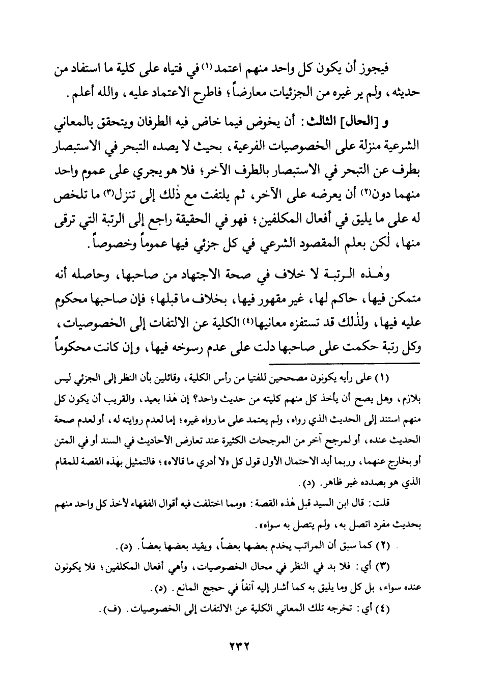 و [الحال] الثَّالِثُ: أَنْ يَخُوضَ فِيمَا خَاضَ فِيهِ الطَّرَفَانِ وَيَتَحَقَّقُ بِالْمَعَانِي الشَّرْعِيَّةِ مُنَزَّلَةً عَلَى الْخُصُوصِيَّاتِ الْفَرْعِيَّةِ، بِحَيْثُ لَا يَصُدُّهُ التَّبَحُّرُ فِي الِاسْتِبْصَارِ بِطَرَفٍ عَنِ التَّبَحُّرِ فِي الِاسْتِبْصَارِ بِالطَّرَفِ الْآخَرِ، فَلَا هُوَ يَجْرِي عَلَى عُمُومٍ وَاحِدٍ مِنْهُمَا دُونَ2 أَنْ يَعْرِضَهُ عَلَى الْآخَرِ، ثُمَّ يَلْتَفِتُ مَعَ ذَلِكَ إِلَى تَنَزُّلِ3 مَا تَلَخَّصَ لَهُ عَلَى مَا يَلِيقُ فِي أَفْعَالِ الْمُكَلَّفِينَ، فَهُوَ فِي الْحَقِيقَةِ رَاجِعٌ إِلَى الرُّتْبَةِ الَّتِي تَرْقَى مِنْهَا، لَكِنْ بِعِلْمِ الْمَقْصُودِ الشَّرْعِيِّ فِي كُلِّ جُزْئِيٍّ فِيهَا عُمُومًا وَخُصُوصًا.