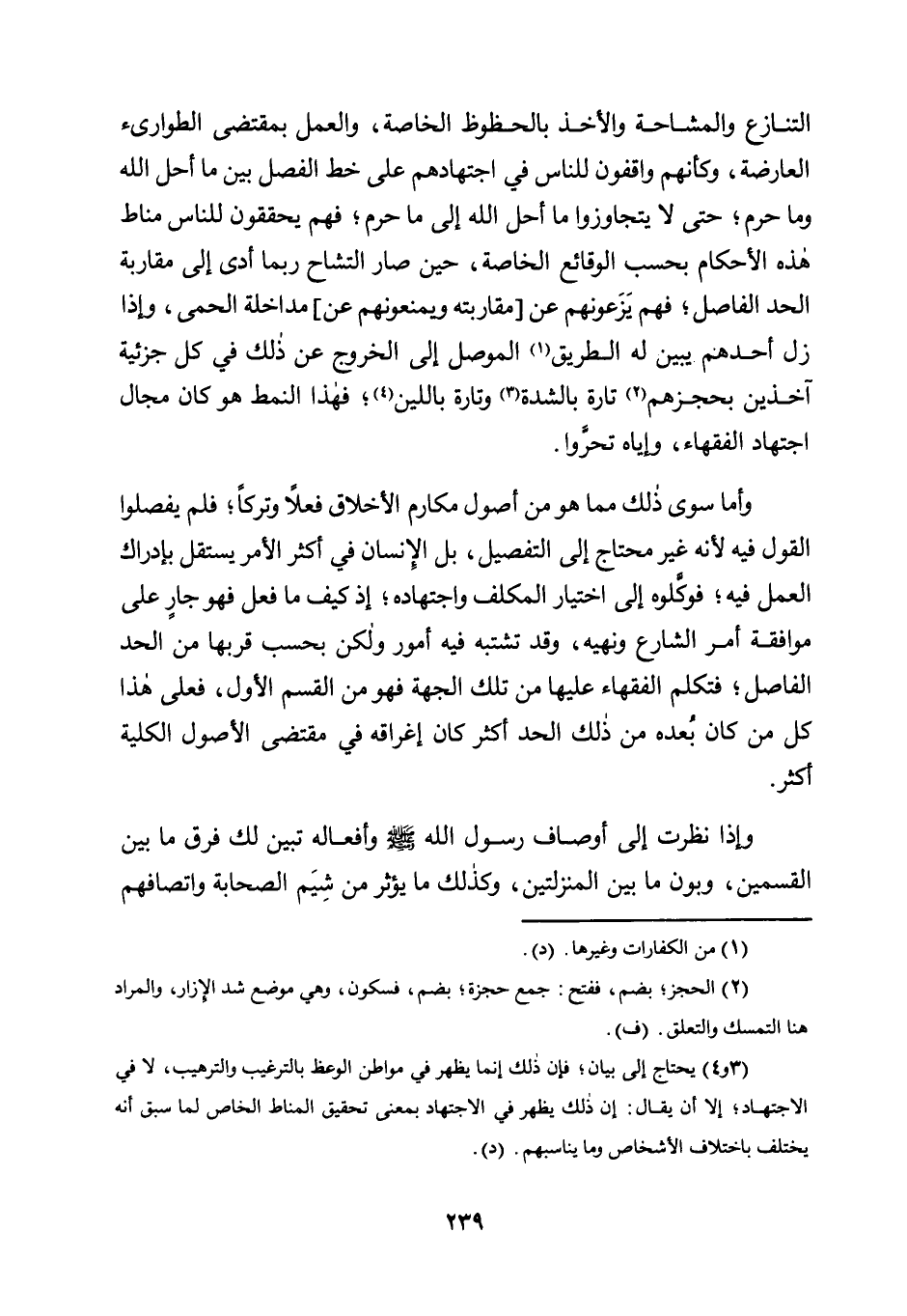 التَّنَازُعِ وَالْمُشَاحَّةِ وَالْأَخْذِ بِالْحُظُوظِ الْخَاصَّةِ، وَالْعَمَلِ بِمُقْتَضَى الطَّوَارِئِ الْعَارِضَةِ، وَكَأَنَّهُمْ وَاقِفُونَ لِلنَّاسِ فِي اجْتِهَادِهِمْ عَلَى خَطِّ الْفَصْلِ بَيْنَ مَا أَحَلَّ اللَّهُ وَمَا حَرَّمَ، حَتَّى لَا يَتَجَاوَزُوا مَا أَحَلَّ اللَّهُ إِلَى مَا حَرَّمَ، فَهُمْ يُحَقِّقُونَ لِلنَّاسِ مَنَاطَ هَذِهِ الْأَحْكَامِ بِحَسَبِ الْوَقَائِعِ الْخَاصَّةِ، حِينَ صَارَ التَّشَاحُّ رُبَّمَا أَدَّى إِلَى مُقَارَبَةِ الْحَدِّ الْفَاصِلِ، فَهُمْ يَزَعُونَهُمْ عَنْ [مُقَارَبَتِهِ وَيَمْنَعُونَهُمْ عَنْ] مُدَاخَلَةِ الْحِمَى، وَإِذَا زَلَّ أَحَدُهُمْ يُبَيِّنُ لَهُ الطَّرِيقُ1 الْمُوَصِّلُ إِلَى الْخُرُوجِ عَنْ ذَلِكَ فِي كُلِّ جُزْئِيَّةٍ آخِذِينَ بِحُجَزِهِمْ2 تَارَةً بِالشِّدَّةِ3، وَتَارَةً بِاللِّينِ4 فَهَذَا النَّمَطُ هُوَ كَانَ مَجَالَ اجْتِهَادِ الْفُقَهَاءِ، وَإِيَّاهُ تَحَرَّوْا.
