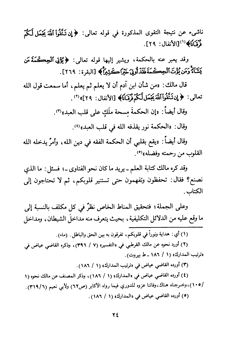 قَالَ مالك: "من شأن ابن آدم أن لا يَعْلَمَ ثُمَّ يَعْلَمَ، أَمَا سَمِعْتَ قَوْلَ اللَّهِ تَعَالَى: {إِنْ تَتَّقُوا اللَّهَ يَجْعَلْ لَكُمْ فُرْقَانًا} [الْأَنْفَالِ: 29] 2.