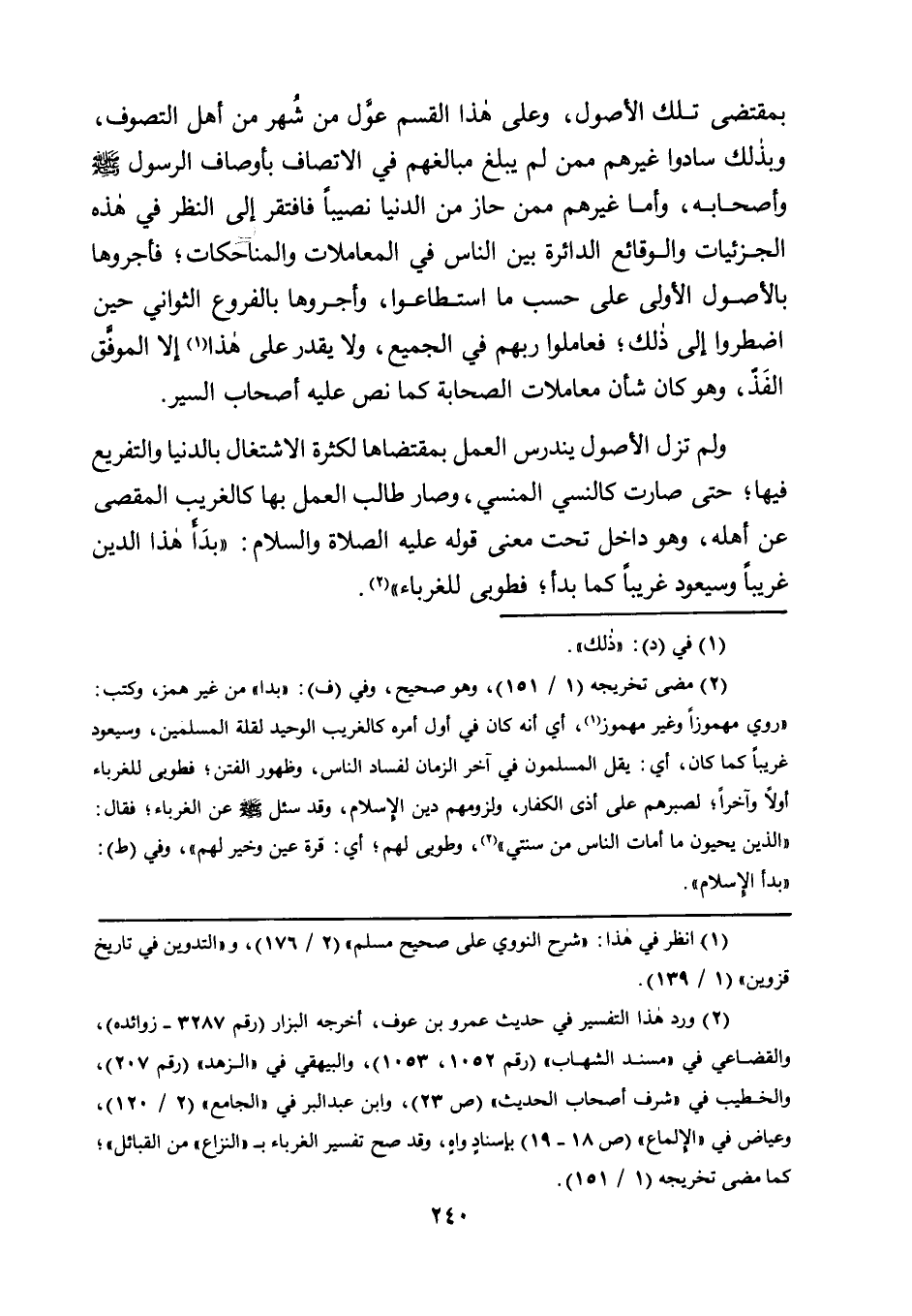 وَلَمْ تَزَلِ الْأُصُولُ يَنْدَرِسُ الْعَمَلُ بِمُقْتَضَاهَا لِكَثْرَةِ الِاشْتِغَالِ بِالدُّنْيَا وَالتَّفْرِيعِ فِيهَا؛ حَتَّى صَارَتْ كَالنَّسْيِ الْمَنْسِيِّ، وَصَارَ طَالِبُ الْعَمَلِ بِهَا كَالْغَرِيبِ الْمُقْصَى عَنْ أَهْلِهِ، وَهُوَ دَاخِلٌ تَحْتِ مَعْنَى قَوْلِهِ عَلَيْهِ الصَّلَاةُ وَالسَّلَامُ: "بَدَأَ هَذَا الدِّينُ غَرِيبًا وَسَيَعُودُ غَرِيبًا كَمَا بَدَأَ؛ فَطُوبَى لِلْغُرَبَاءِ" 2.