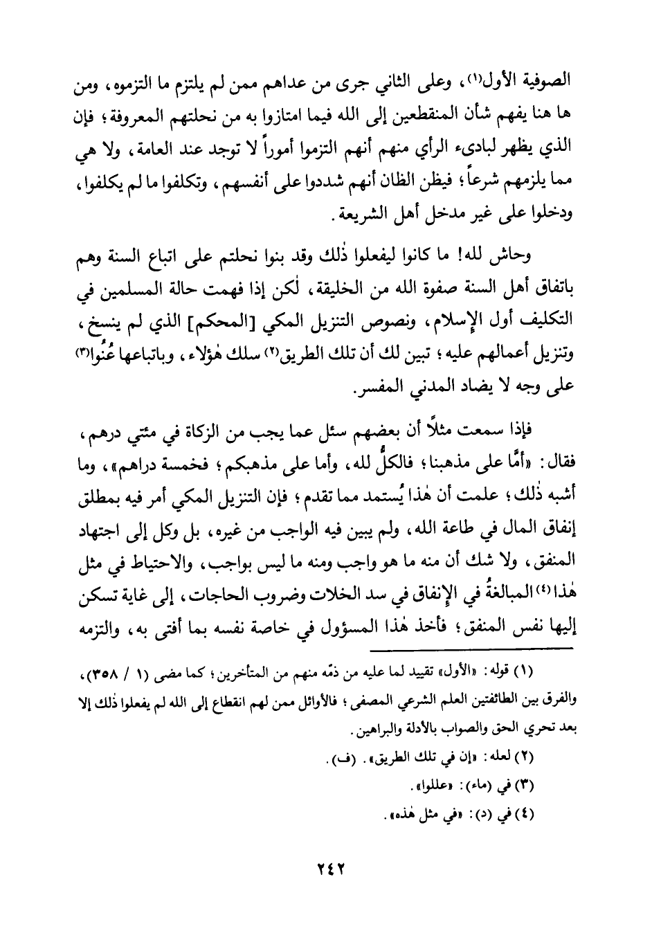 1 قوله: "الأول" تقييد لما عليه من ذمه منهم من المتأخرين؛ كما مضى "1/ 358"، والفرق بين الطائفتين العلم الشرعي المصفى؛ فالأوائل ممن لهم انقطاع إلى الله لم يفعلوا ذلك إلا بعد تحري الحق والصواب بالأدلة والبراهين.