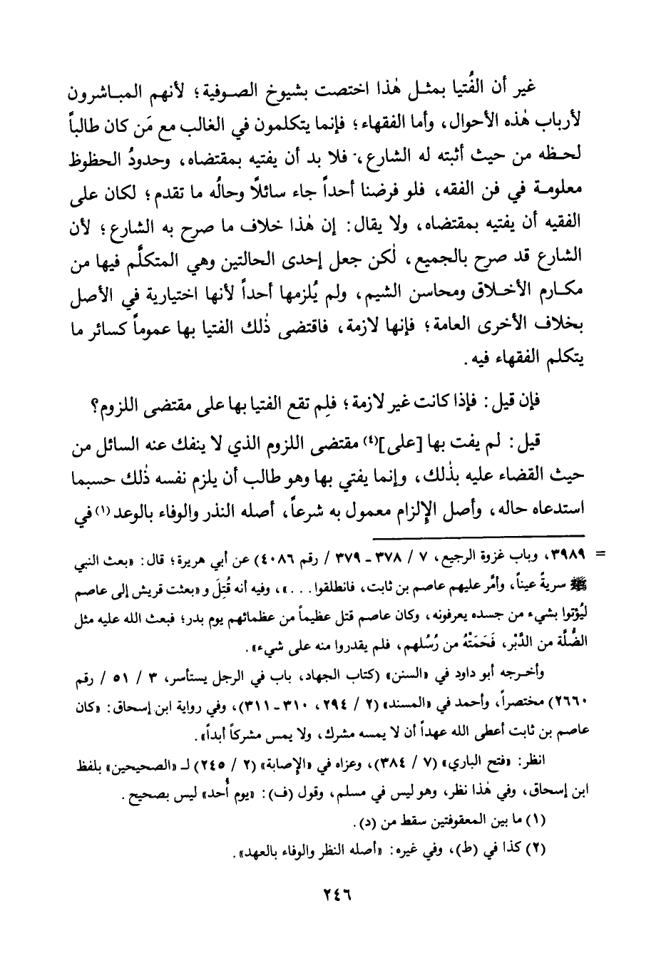 غَيْرَ أَنَّ الْفُتْيَا بِمِثْلِ هَذَا اخْتُصَّتْ بِشُيُوخِ الصُّوفِيَّةِ؛ لِأَنَّهُمُ الْمُبَاشِرُونَ لِأَرْبَابِ هَذِهِ الْأَحْوَالِ، وَأَمَّا الْفُقَهَاءُ؛ فَإِنَّمَا يَتَكَلَّمُونَ فِي الْغَالِبِ مَعَ مَنْ كَانَ طَالِبًا لِحَظِّهِ مِنْ حَيْثُ أَثْبَتَهُ لَهُ الشَّارِعُ، فَلَا بُدَّ أَنْ يُفْتِيَهُ بِمُقْتَضَاهُ، وَحُدُودُ الْحُظُوظِ مَعْلُومَةٌ فِي فَنِّ الْفِقْهِ، فَلَوْ فَرَضْنَا أَحَدًا جَاءَ سَائِلًا وَحَالُهُ مَا تَقَدَّمَ؛ لَكَانَ عَلَى الْفَقِيهِ أَنْ يُفْتِيَهُ بِمُقْتَضَاهُ، وَلَا يُقَالُ: إِنَّ هَذَا خِلَافَ مَا صَرَّحَ بِهِ الشَّارِعُ؛ لِأَنَّ الشَّارِعَ قَدْ صَرَّحَ بِالْجَمِيعِ، لَكِنْ جَعَلَ إِحْدَى الْحَالَتَيْنِ وَهِيَ الْمُتَكَلَّمُ فِيهَا مِنْ مَكَارِمِ الْأَخْلَاقِ وَمَحَاسِنِ الشِّيَمِ، وَلَمْ يُلْزِمْهَا أَحَدًا؛ لِأَنَّهَا اخْتِيَارِيَّةٌ فِي الْأَصْلِ بِخِلَافِ الْأُخْرَى الْعَامَّةِ؛ فَإِنَّهَا لَازِمَةٌ، فَاقْتَضَى ذَلِكَ الْفُتْيَا بِهَا عُمُومًا كَسَائِرِ مَا يَتَكَلَّمُ الْفُقَهَاءُ فِيهِ.