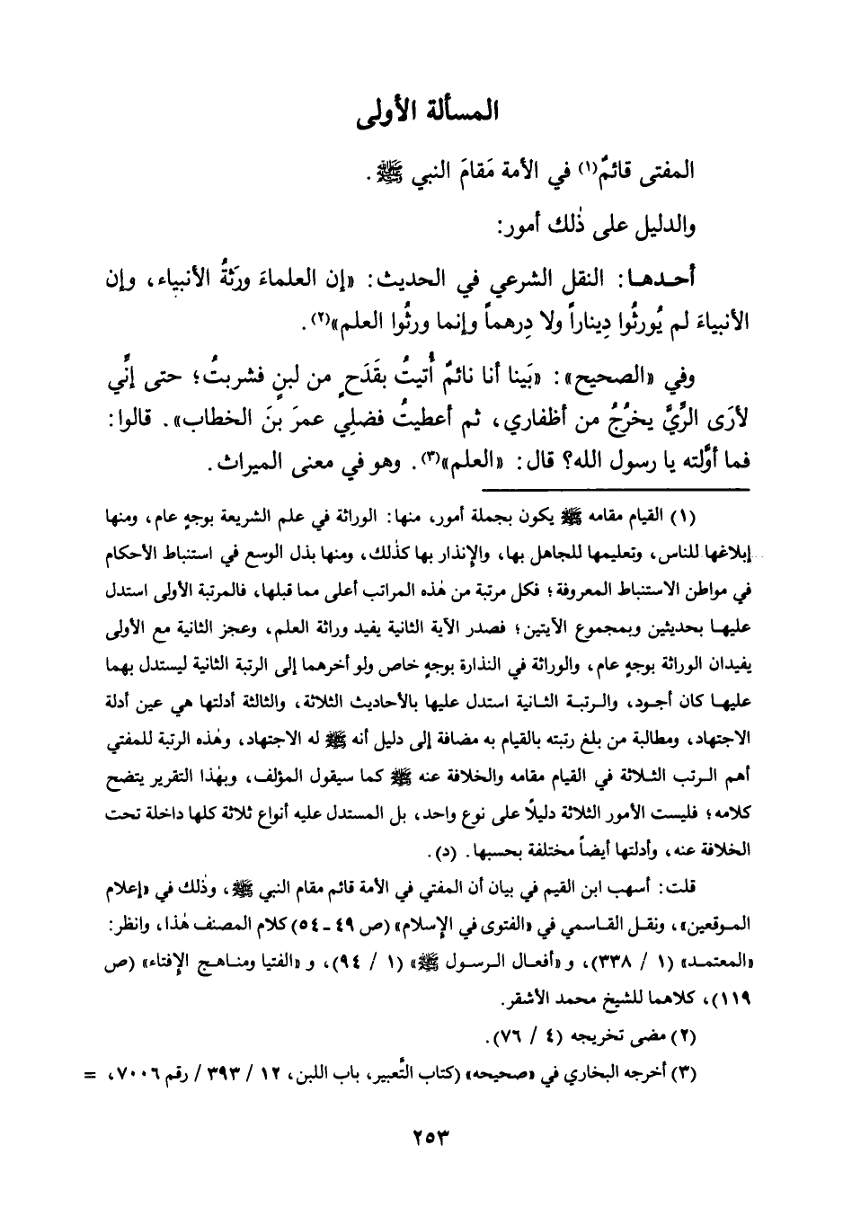 الْمُفْتِي قَائِمٌ1 فِي الْأُمَّةِ مَقَامَ النَّبِيِّ صَلَّى اللَّهُ عَلَيْهِ وَسَلَّمَ.