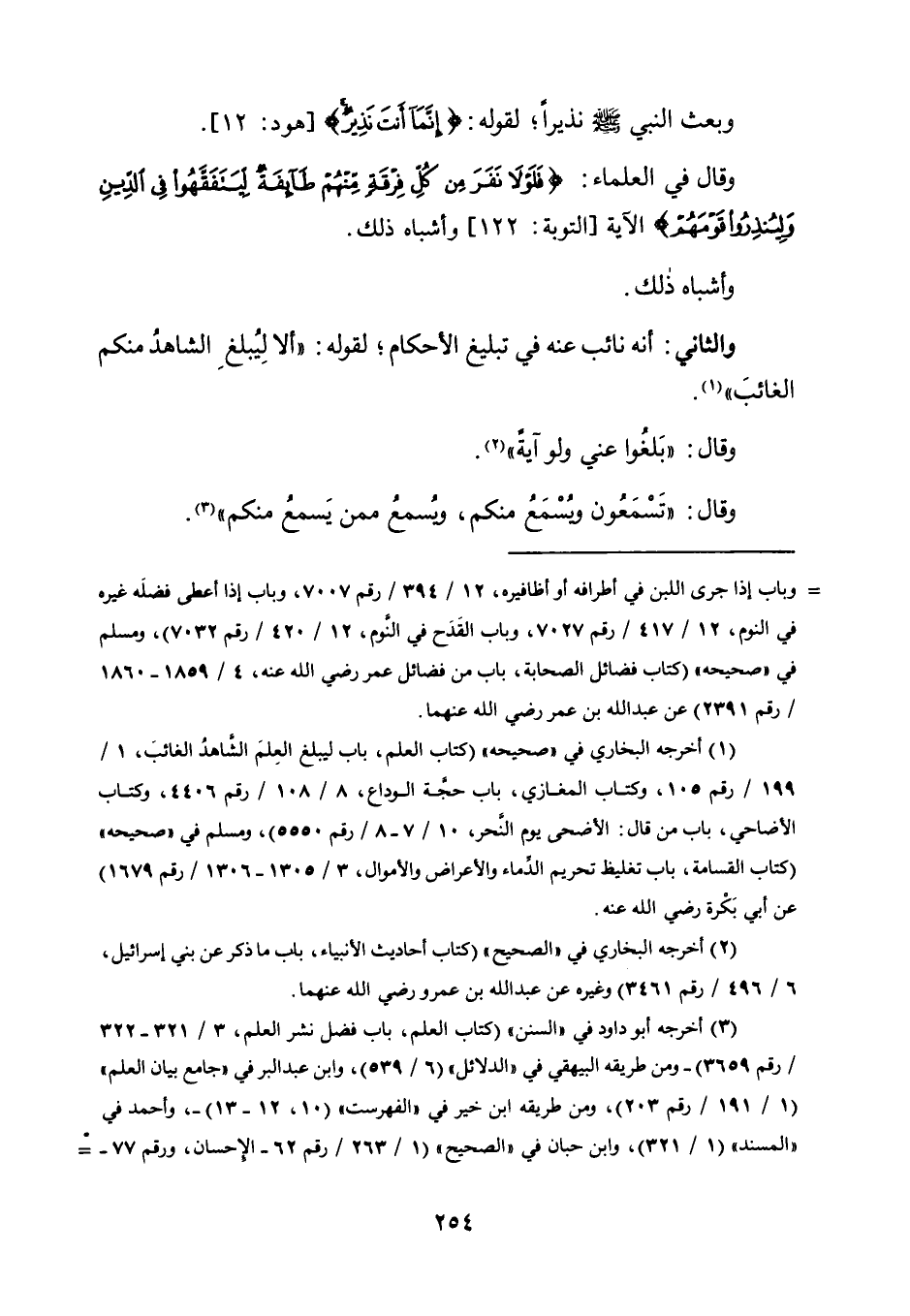 وَقَالَ فِي الْعُلَمَاءِ: {فَلَوْلا نَفَرَ مِنْ كُلِّ فِرْقَةٍ مِنْهُمْ طَائِفَةٌ لِيَتَفَقَّهُوا فِي الدِّينِ وَلِيُنْذِرُوا قَوْمَهُمْ} الْآيَةَ [التَّوْبَةِ: 122] ، وَأَشْبَاهُ ذَلِكَ.