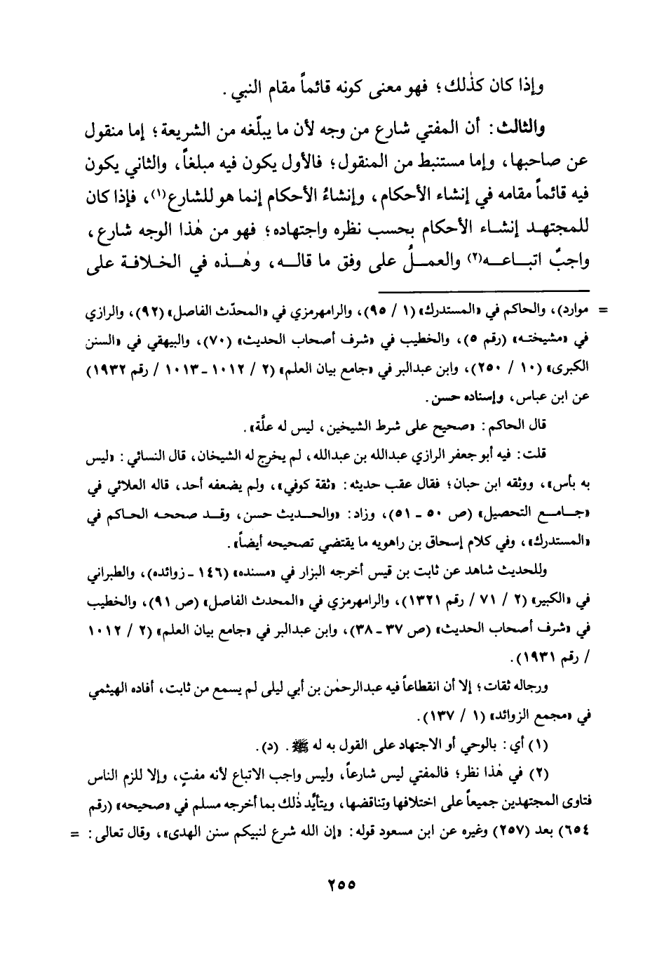 وَالثَّالِثُ: أَنَّ الْمُفْتِيَ شَارِعٌ مِنْ وَجْهٍ؛ لِأَنَّ مَا يُبَلِّغُهُ مِنَ الشَّرِيعَةِ؛ إِمَّا مَنْقُولٌ عَنْ صَاحِبِهَا، وَإِمَّا مُسْتَنْبَطٌ مِنَ الْمَنْقُولِ؛ فَالْأَوَّلُ يَكُونُ فِيهِ مُبَلِّغًا، وَالثَّانِي يَكُونُ فِيهِ قَائِمًا مَقَامَهُ فِي إِنْشَاءِ الْأَحْكَامِ، وإنشاءُ الْأَحْكَامِ إِنَّمَا هُوَ لِلشَّارِعِ1، فَإِذَا كَانَ لِلْمُجْتَهِدِ إِنْشَاءُ الْأَحْكَامِ بِحَسَبِ نَظَرِهِ وَاجْتِهَادِهِ؛ فَهُوَ مِنْ هَذَا الْوَجْهِ شَارِعٌ، وَاجِبٌ اتِّبَاعُهُ2 وَالْعَمَلُ عَلَى وَفْقِ ما قاله، وهذه هي الخلافة على