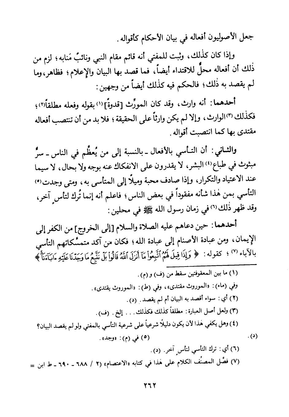 وَالثَّانِي: أَنَّ التَّأَسِّيَ بِالْأَفْعَالِ -بِالنِّسْبَةِ إِلَى مَنْ يُعظَّم فِي النَّاسِ- سِرٌّ مَبْثُوثٌ فِي طِبَاعِ4 الْبَشَرِ، لَا يَقْدِرُونَ عَلَى الِانْفِكَاكِ عَنْهُ بِوَجْهٍ وَلَا بِحَالٍ، لَا سِيَّمَا عِنْدَ الِاعْتِيَادِ وَالتَّكْرَارِ، وَإِذَا صَادَفَ مَحَبَّةً وَمَيْلًا إِلَى الْمُتَأَسَّى بِهِ، وَمَتَى وَجَدْتَ5 التَّأَسِّيَ بِمَنْ هَذَا شَأْنُهُ مَفْقُودًا فِي بَعْضِ النَّاسِ؛ فَاعْلَمْ أَنَّهُ إِنَّمَا تُرِكَ لتأسٍ آخَرَ، وَقَدْ ظَهَرَ ذَلِكَ6 فِي زَمَانِ رَسُولِ اللَّهِ صَلَّى اللَّهُ عَلَيْهِ وَسَلَّمَ فِي مَحَلَّيْنِ: