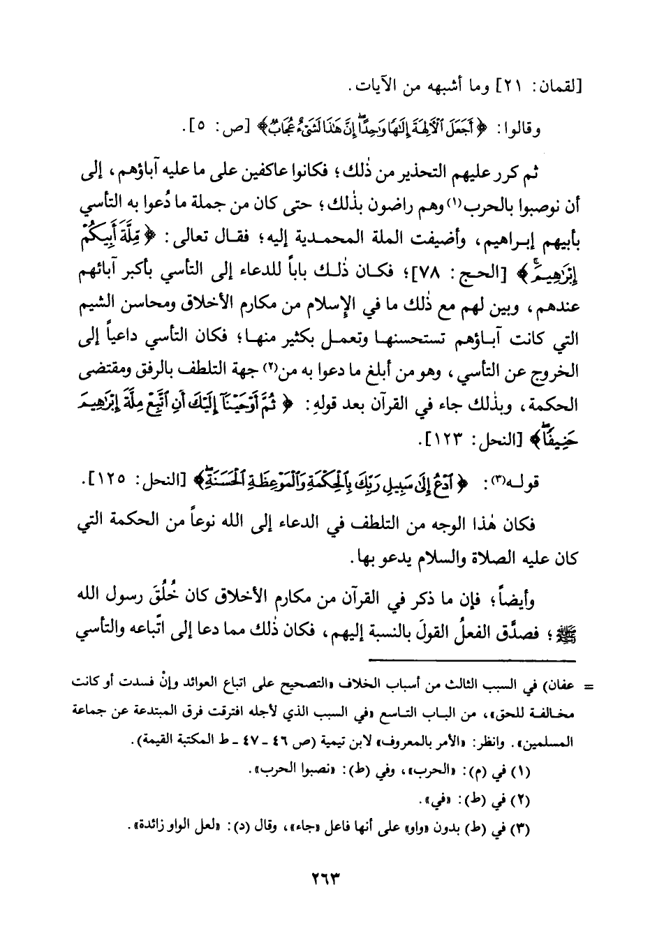 ثُمَّ كَرَّرَ عَلَيْهِمُ التَّحْذِيرَ مِنْ ذَلِكَ؛ فَكَانُوا عَاكِفِينَ عَلَى مَا عَلَيْهِ آبَاؤُهُمْ، إِلَى أَنْ نُوصِبُوا بِالْحَرْبِ1 وَهُمْ رَاضُونَ بِذَلِكَ؛ حَتَّى كَانَ مِنْ جُمْلَةِ مَا دُعوا بِهِ التَّأَسِّي بِأَبِيهِمْ إِبْرَاهِيمَ، وَأُضِيفَتِ الْمِلَّةُ الْمُحَمَّدِيَّةُ إِلَيْهِ؛ فَقَالَ تَعَالَى: {مِلَّةَ أَبِيكُمْ إِبْرَاهِيم} [الْحَجِّ: 78] ؛ فَكَانَ ذَلِكَ بَابًا لِلدُّعَاءِ إِلَى التَّأَسِّي بِأَكْبَرِ آبَائِهِمْ عِنْدَهُمْ، وبيَّن لَهُمْ مَعَ ذَلِكَ مَا فِي الْإِسْلَامِ مِنْ مَكَارِمِ الْأَخْلَاقِ وَمَحَاسِنِ الشِّيَمِ الَّتِي كَانَتْ آبَاؤُهُمْ تَسْتَحْسِنُهَا وَتَعْمَلُ بِكَثِيرٍ مِنْهَا؛ فَكَانَ التَّأَسِّي دَاعِيًا إِلَى الْخُرُوجِ عَنِ التَّأَسِّي، وَهُوَ مِنْ أَبْلَغِ مَا دُعُوا بِهِ مِنْ2 جِهَةِ التَّلَطُّفِ بِالرِّفْقِ وَمُقْتَضَى الْحِكْمَةِ، وَبِذَلِكَ جَاءَ فِي الْقُرْآنِ بَعْدَ قَوْلِهِ: {ثُمَّ أَوْحَيْنَا إِلَيْكَ أَنِ اتَّبِعْ مِلَّةَ إِبْرَاهِيمَ حَنِيفًا} [النَّحْلِ: 123] .
