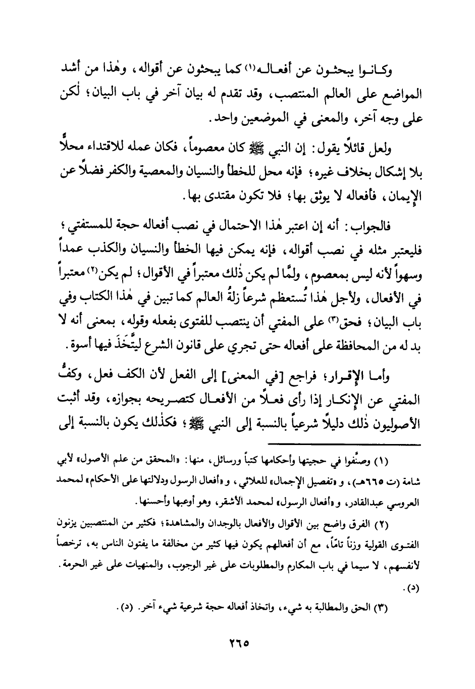 وَكَانُوا يَبْحَثُونَ عَنْ أَفْعَالِهِ1 كَمَا يَبْحَثُونَ عَنْ أَقْوَالِهِ، وَهَذَا مِنْ أَشَدِّ الْمَوَاضِعِ عَلَى الْعَالِمِ الْمُنْتَصِبِ، وَقَدْ تَقَدَّمَ لَهُ بَيَانٌ آخَرُ فِي بَابِ الْبَيَانِ؛ لَكِنْ عَلَى وَجْهٍ آخَرَ، وَالْمَعْنَى فِي الْمَوْضِعَيْنِ وَاحِدٌ.