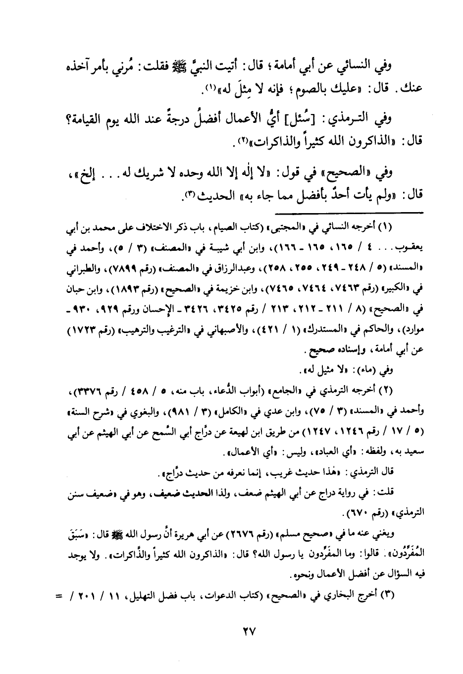 وَفِي التِّرْمِذِيِّ: [سُئِلَ] أَيُّ الْأَعْمَالِ أَفْضَلُ دَرَجَةً عِنْدَ اللَّهِ يَوْمَ الْقِيَامَةِ؟ قَالَ: "الذَّاكِرُونَ اللَّهَ كَثِيرًا وَالذَّاكِرَاتُ"2.