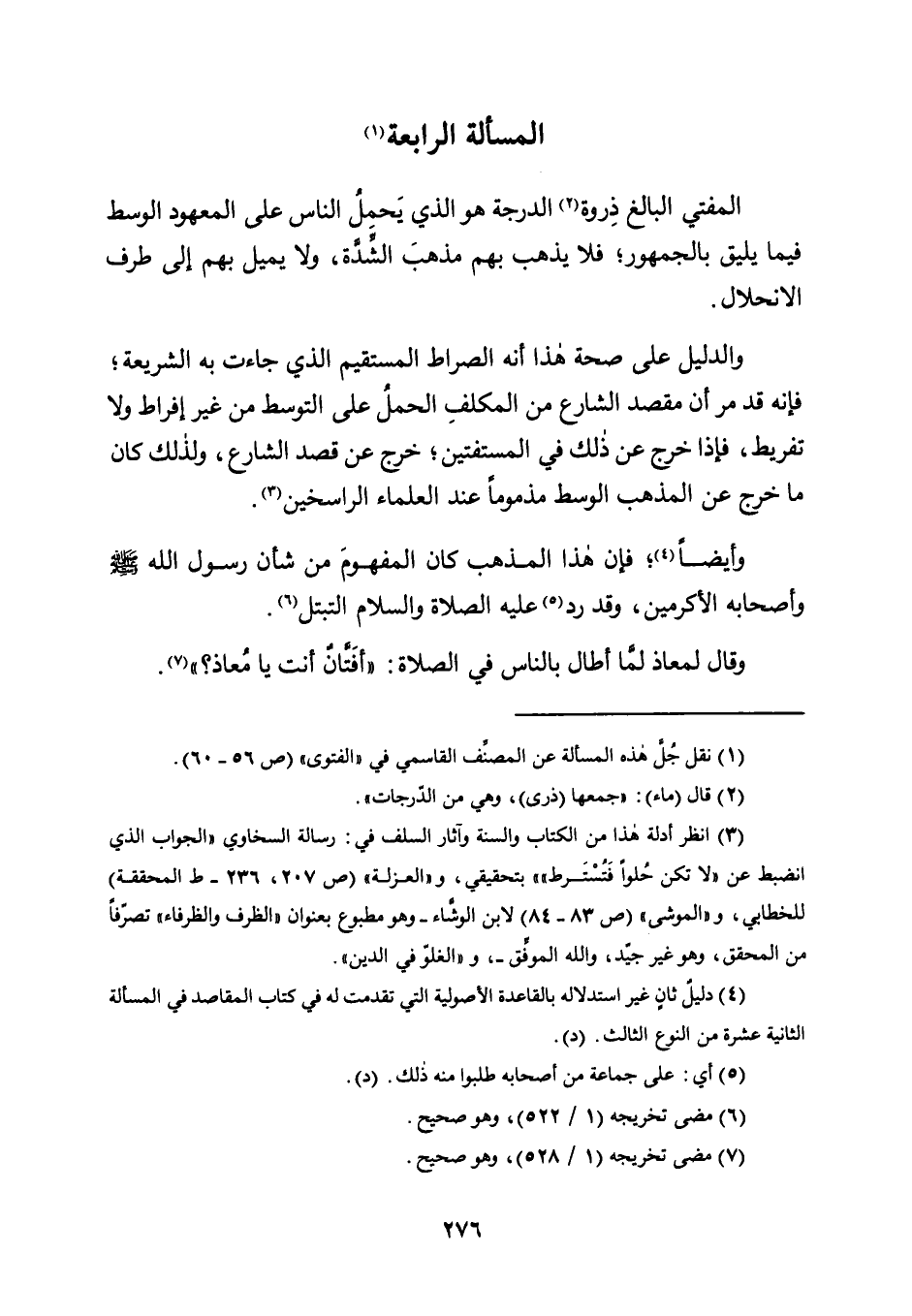 الْمُفْتِي الْبَالِغُ ذُرْوَةِ2 الدَّرَجَةِ هُوَ الَّذِي يَحْمِلُ النَّاسَ عَلَى الْمَعْهُودِ الْوَسَطِ فِيمَا يَلِيقُ بِالْجُمْهُورِ؛ فَلَا يَذْهَبُ بِهِمْ مَذْهَبَ الشِّدَّةِ، وَلَا يَمِيلُ بِهِمْ إِلَى طَرَفِ الِانْحِلَالِ.