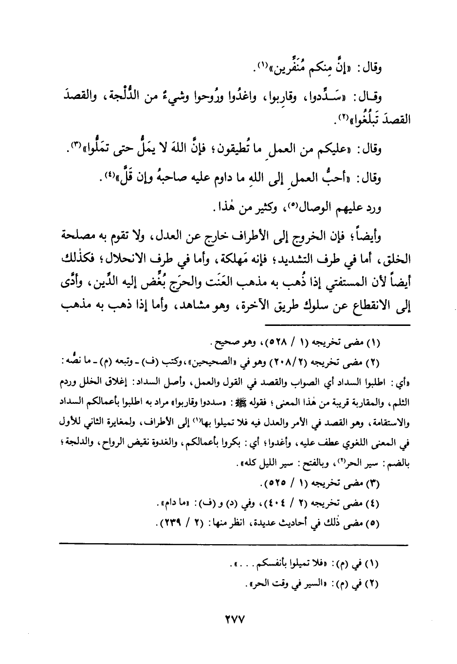 وَقَالَ: "سَدِّدُوا، وَقَارِبُوا، واغدُوا ورُوحُوا وَشَيْءٌ مِنَ الدُّلْجَةِ، والقصدَ القصدَ تبلُغُوا" 2.