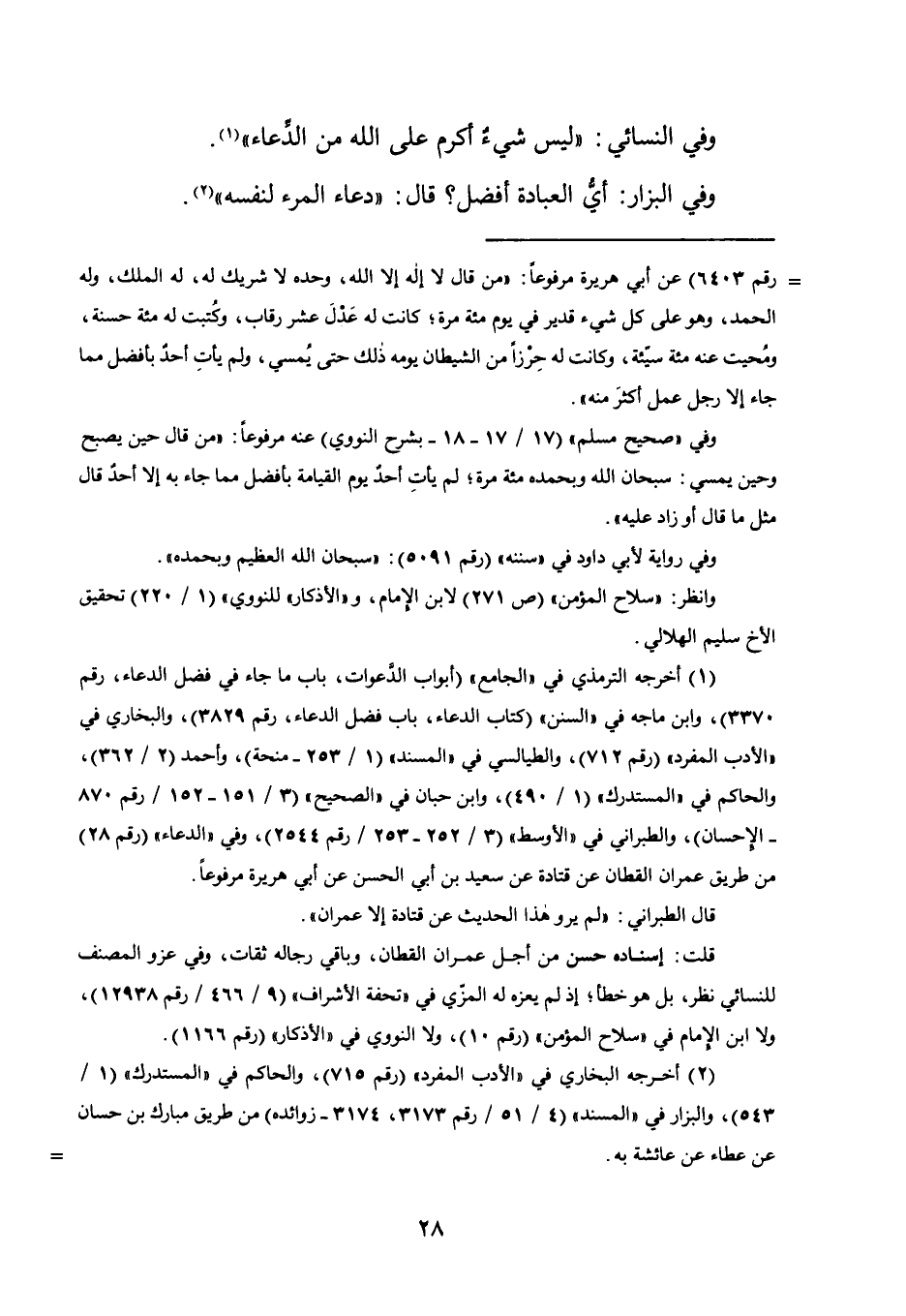 = رقم 6403" عن أبي هريرة مرفوعًا: "من قال: لَا إِلَهَ إِلَّا اللَّهُ، وَحْدَهُ لَا شَرِيكَ له، له الحمد، وهو على كل شيء قدير في يوم مئة مرة؛ كانت له عدل عشر رقاب، وكتبت له مئة حسن، ومحيت عنه مئة سيئة، وكانت له حرزًا من الشيطان يومه ذلك حتى يمسي، ولم يأت أحد بأفضل مما جاء إلا رجل عمل أكثر منه".