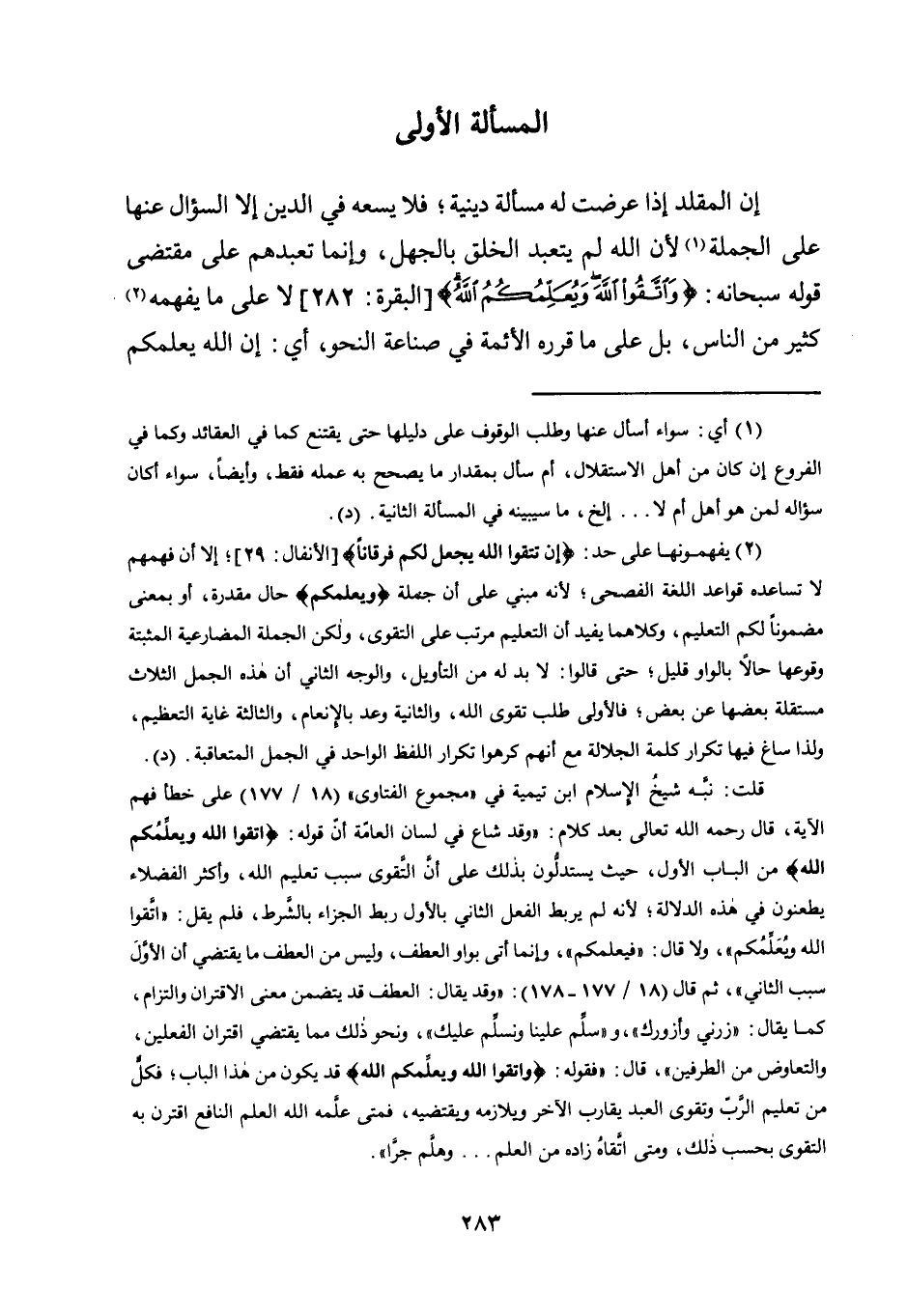 إِنَّ الْمُقَلِّدَ إِذَا عَرَضَتْ لَهُ مَسْأَلَةٌ دِينِيَّةٌ؛ فَلَا يَسَعُهُ فِي الدِّينِ إِلَّا السُّؤَالُ عَنْهَا عَلَى الْجُمْلَةِ1؛ لِأَنَّ اللَّهَ لَمْ يتعبد الخلق بالجهل، وإنما تعبدهم على متضى قَوْلِهِ سُبْحَانَهُ: {وَاتَّقُوا اللَّهَ وَيُعَلِّمُكُمُ اللَّه} [الْبَقَرَةِ: 282] لَا عَلَى مَا يَفْهَمُهُ2 كَثِيرٌ مِنَ النَّاسِ، بَلْ عَلَى مَا قَرَّرَهُ الْأَئِمَّةُ فِي صِنَاعَةِ النحو، أي: إن الله يعلمكم