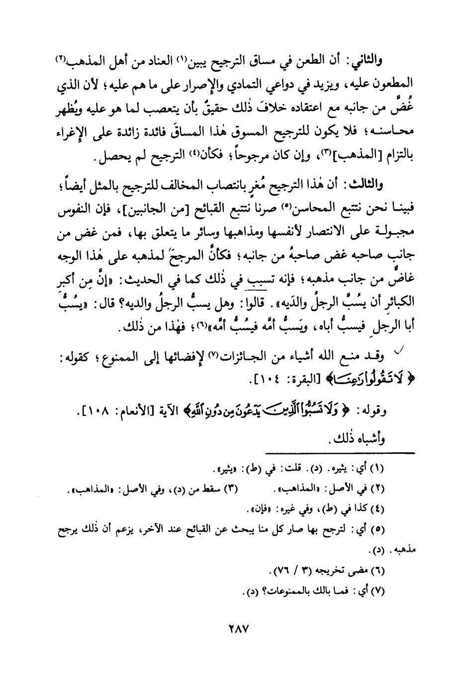 وَالثَّالِثُ: أَنَّ هَذَا التَّرْجِيحَ مغرٍ بِانْتِصَابِ الْمُخَالِفِ لِلتَّرْجِيحِ بِالْمِثْلِ أَيْضًا؛ فَبَيْنَا نَحْنُ نتتبع المحاسن5 صرنا نتتبع القبائح [من المجانبين] ؛ فَإِنَّ النُّفُوسَ مَجْبُولَةٌ عَلَى الِانْتِصَارِ لِأَنْفُسِهَا وَمَذَاهِبِهَا وَسَائِرِ مَا يَتَعَلَّقُ بِهَا؛ فَمَنْ غَضَّ مِنْ جَانِبِ صَاحِبِهِ غَضَّ صَاحِبُهُ مِنْ جَانِبِهِ؛ فَكَأَنَّ الْمُرَجِّحَ لِمَذْهَبِهِ عَلَى هَذَا الْوَجْهِ غاضٌّ مِنْ جَانِبِ مَذْهَبِهِ؛ فَإِنَّهُ تَسَبَّبَ فِي ذَلِكَ كَمَا فِي الْحَدِيثِ: "إِنَّ مِنْ أَكْبَرِ الْكَبَائِرِ أَنْ يَسُبَّ الرَّجُلُ وَالِدَيْهِ". قَالُوا: وَهَلْ يَسُبُّ الرَّجُلُ وَالِدَيْهِ؟ قَالَ: "يَسُبُّ أَبَا الرَّجُلِ فَيَسُبُّ أَبَاهُ، وَيَسُبُّ أُمَّهُ فَيَسُبُّ أُمَّهُ" 6؛ فَهَذَا مِنْ ذَلِكَ.