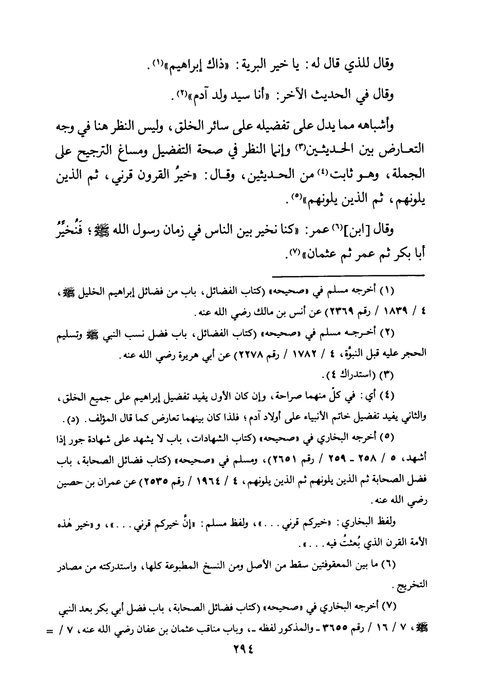 وَأَشْبَاهُهُ مِمَّا يَدُلُّ عَلَى تَفْضِيلِهِ عَلَى سَائِرِ الْخَلْقِ، وَلَيْسَ النَّظَرُ هُنَا فِي وَجْهِ التَّعَارُضِ بَيْنَ الْحَدِيثَيْنِ3 وَإِنَّمَا النَّظَرُ فِي صِحَّةِ التَّفْضِيلِ وَمُسَاغِ التَّرْجِيحِ عَلَى الْجُمْلَةِ، وَهُوَ ثَابِتٌ4 مِنَ الْحَدِيثَيْنِ، وَقَالَ: "خَيْرُ الْقُرُونِ قَرْنِي، ثُمَّ الَّذِينَ يَلُونَهُمْ، ثُمَّ الَّذِينَ يَلُونَهُمْ" 5.