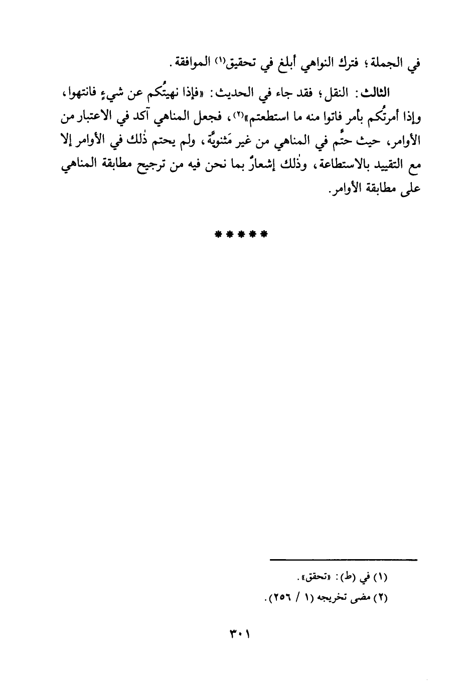 الثَّالِثُ: النَّقْلُ؛ فَقَدْ جَاءَ فِي الْحَدِيثِ: "فَإِذَا نَهَيْتُكُمْ عَنْ شَيْءٍ فَانْتَهُوا، وَإِذَا أَمَرْتُكُمْ بِأَمْرٍ؛ فَأْتُوا مِنْهُ مَا اسْتَطَعْتُمْ" 2، فَجَعَلَ الْمَنَاهِيَ آكَدُ فِي الِاعْتِبَارِ مِنَ الْأَوَامِرِ، حَيْثُ حَتَّمَ فِي الْمَنَاهِي مِنْ غَيْرِ مَثْنَوِيَّةٍ، وَلَمْ يُحَتِّمْ ذَلِكَ فِي الْأَوَامِرِ إِلَّا مَعَ التَّقْيِيدِ بِالِاسْتِطَاعَةِ، وَذَلِكَ إِشْعَارٌ بِمَا نَحْنُ فِيهِ مِنْ تَرْجِيحِ مطابقة المناهي على مطابقة الأوامر.