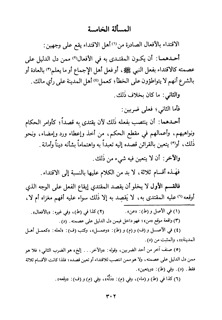 أَحَدُهُمَا: أَنْ يَكُونَ المقتدى به بالأفعال2 مِمَّنْ دَلَّ الدَّلِيلُ عَلَى عِصْمَتِهِ كَالِاقْتِدَاءِ بِفِعْلِ النَّبِيِّ صَلَّى اللَّهُ عَلَيْهِ وَسَلَّمَ، أَوْ فِعْلِ أَهْلِ الْإِجْمَاعِ أَوْ مَا يُعْلَمُ3 بِالْعَادَةِ أَوْ بِالشَّرْعِ أَنَّهُمْ لَا يَتَوَاطَئُونَ عَلَى الْخَطَأِ؛ كَعَمَلِ4 أَهْلِ الْمَدِينَةِ عَلَى رَأْيِ مَالِكٍ.