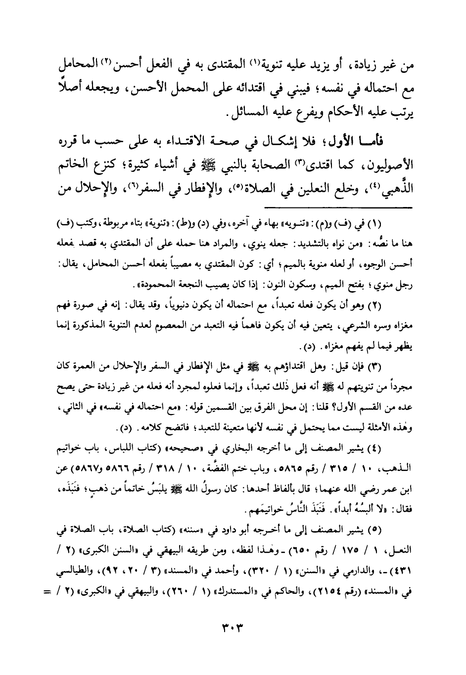 مِنْ غَيْرِ زِيَادَةٍ، أَوْ يَزِيدُ عَلَيْهِ تَنْوِيَةُ1 الْمُقْتَدَى بِهِ فِي الْفِعْلِ أَحَسَنُ2 الْمَحَامِلِ مَعَ احْتِمَالِهِ فِي نَفْسِهِ؛ فَيَبْنِي فِي اقْتِدَائِهِ عَلَى الْمَحْمَلِ الْأَحْسَنِ، وَيَجْعَلُهُ أَصْلًا يُرَتَّبُ عَلَيْهِ الْأَحْكَامُ وَيُفَرَّعُ عَلَيْهِ الْمَسَائِلَ.
